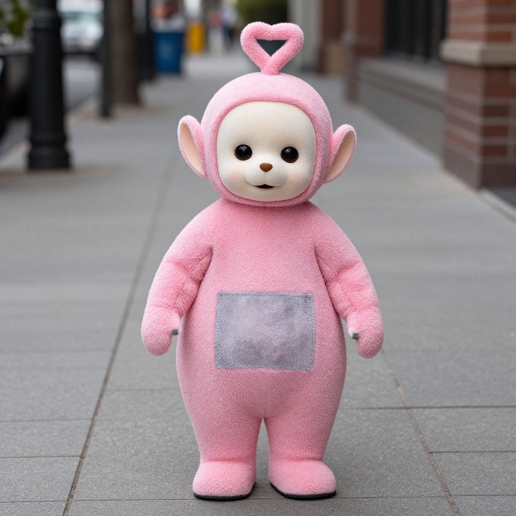 Pink Teletubby Costume, in a pink costume standing on a sidewalk
