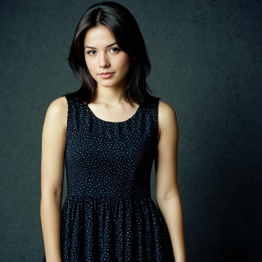 Green midi dress,1girl, solo, brown hair, realistic, dress, green dress, long hair, brown eyes, looking at viewer, standing, simple background, lips