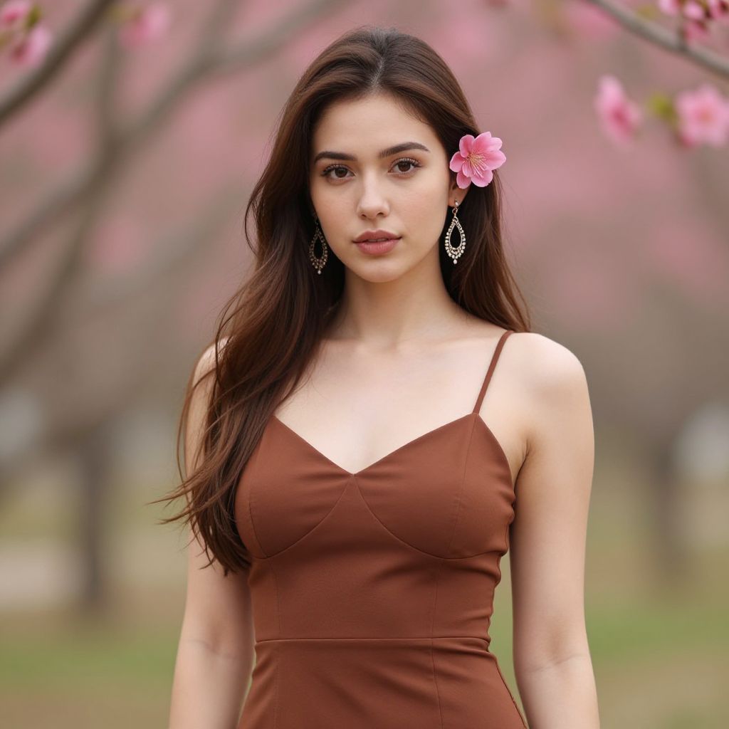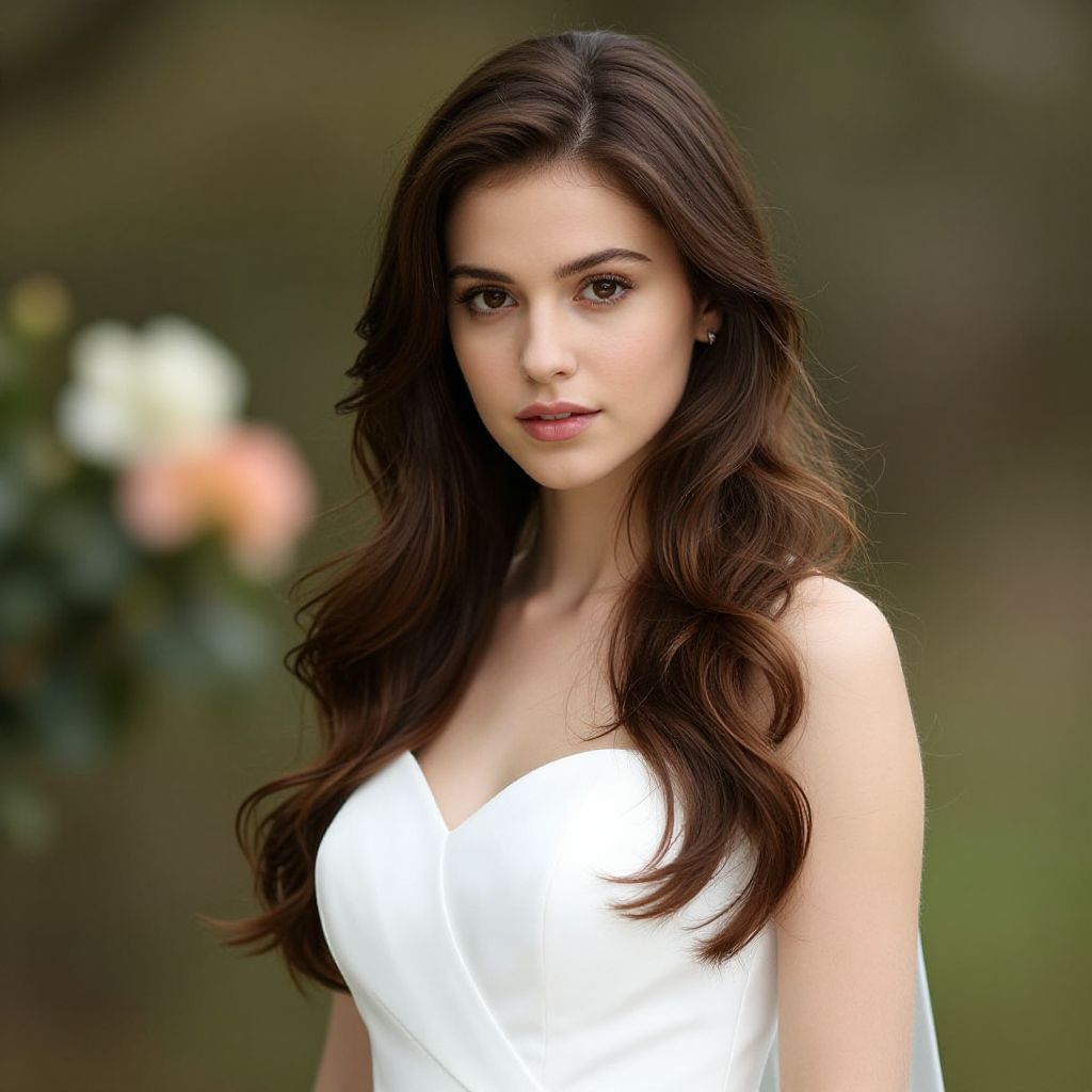 Photograph of a beautiful woman with fair skin, dark hair in an updo adorned with pink and white flowers, wearing gold strapless dress, pearl