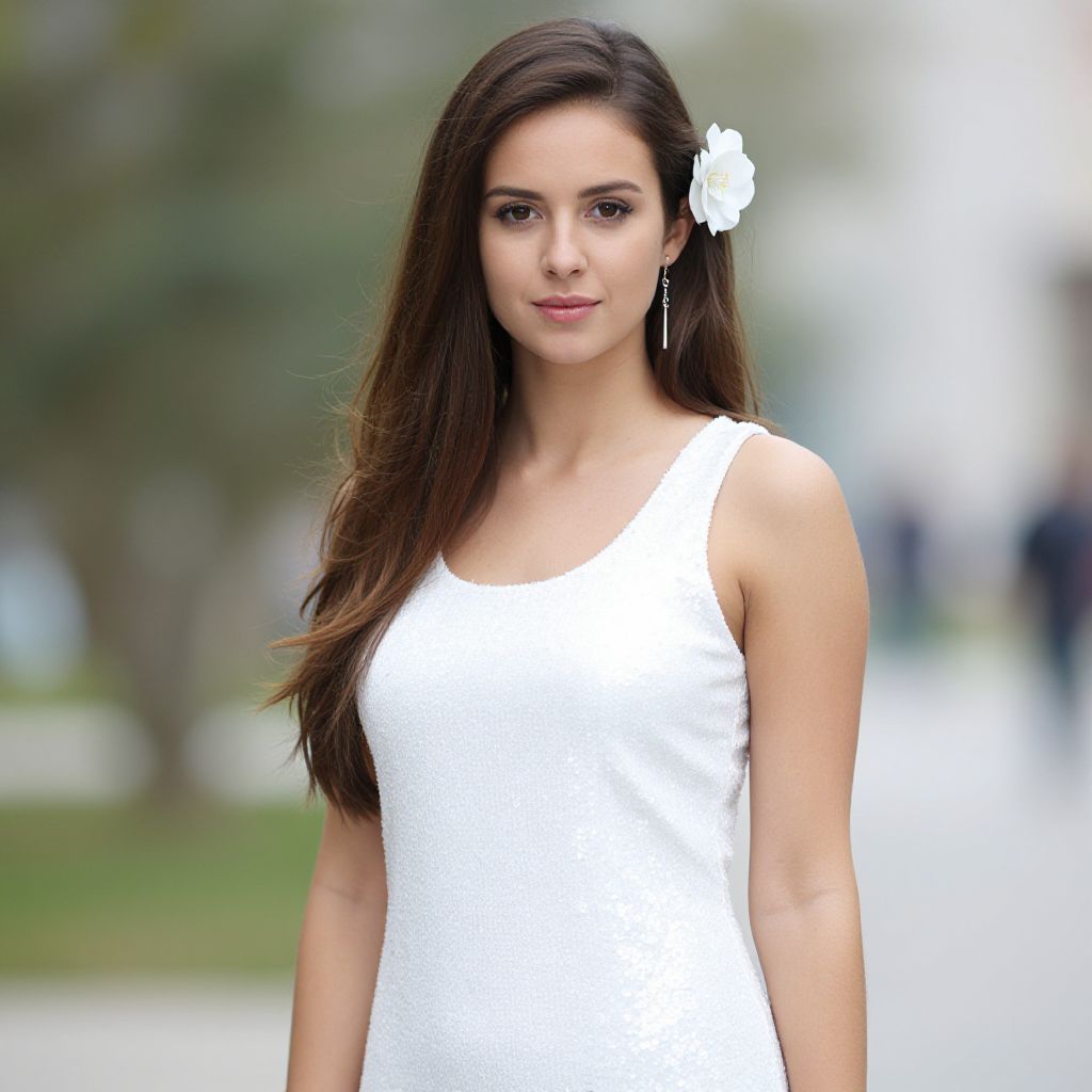 "janine melnitz costume, 1girl, solo, hair ornament, jewelry, flower, hair flower, bracelet, standing, dress, realistic, hair bun Realistic photo of casual sexy person with pretty face"