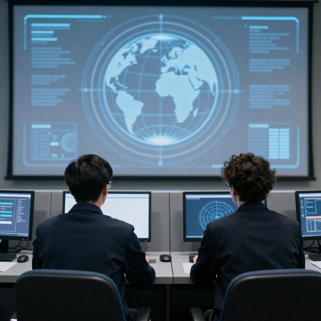 Photograph of a control room with multiple people. Foreground shows a woman with shoulder-length hair in a patterned shirt, and a man with short hair in a white shirt, both facing a large map display. Background has several technicians seated at desks with equipment. Monitors with various images above the map display. Bright control panel with multicolored buttons in the foreground. Technicians' faces not clearly defined.