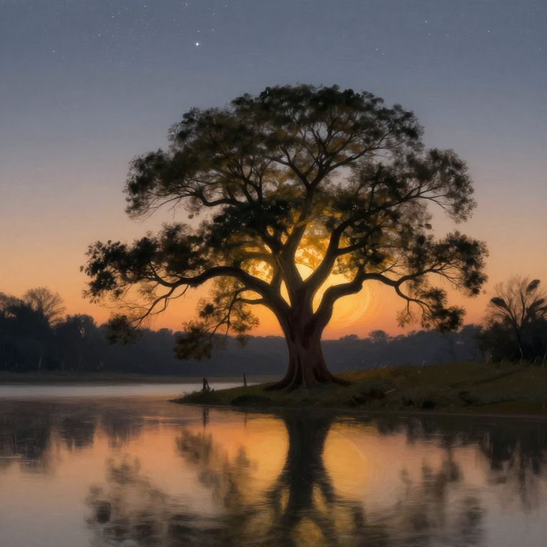 A serene landscape featuring a large satr-shaped tree glowing softly in twilight, surrounded by a calm lake reflecting the stars above, subtle magical aura, impressionistic style with soft brush strokes and warm palette