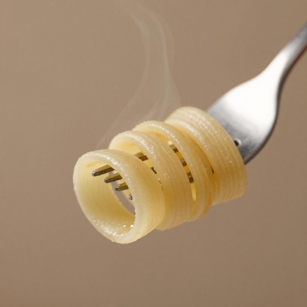 This is a close-up, black-and-white photograph of a shiny, stainless steel fork and knife, lying crossed on a white surface. The camera angle is slightly below the fork, highlighting the fork's tines in the foreground. The background is blurred, creating a shallow depth of field that focuses on the fork and knife. The lighting is soft, with minimal shadows, giving the metal a reflective, almost glossy appearance.