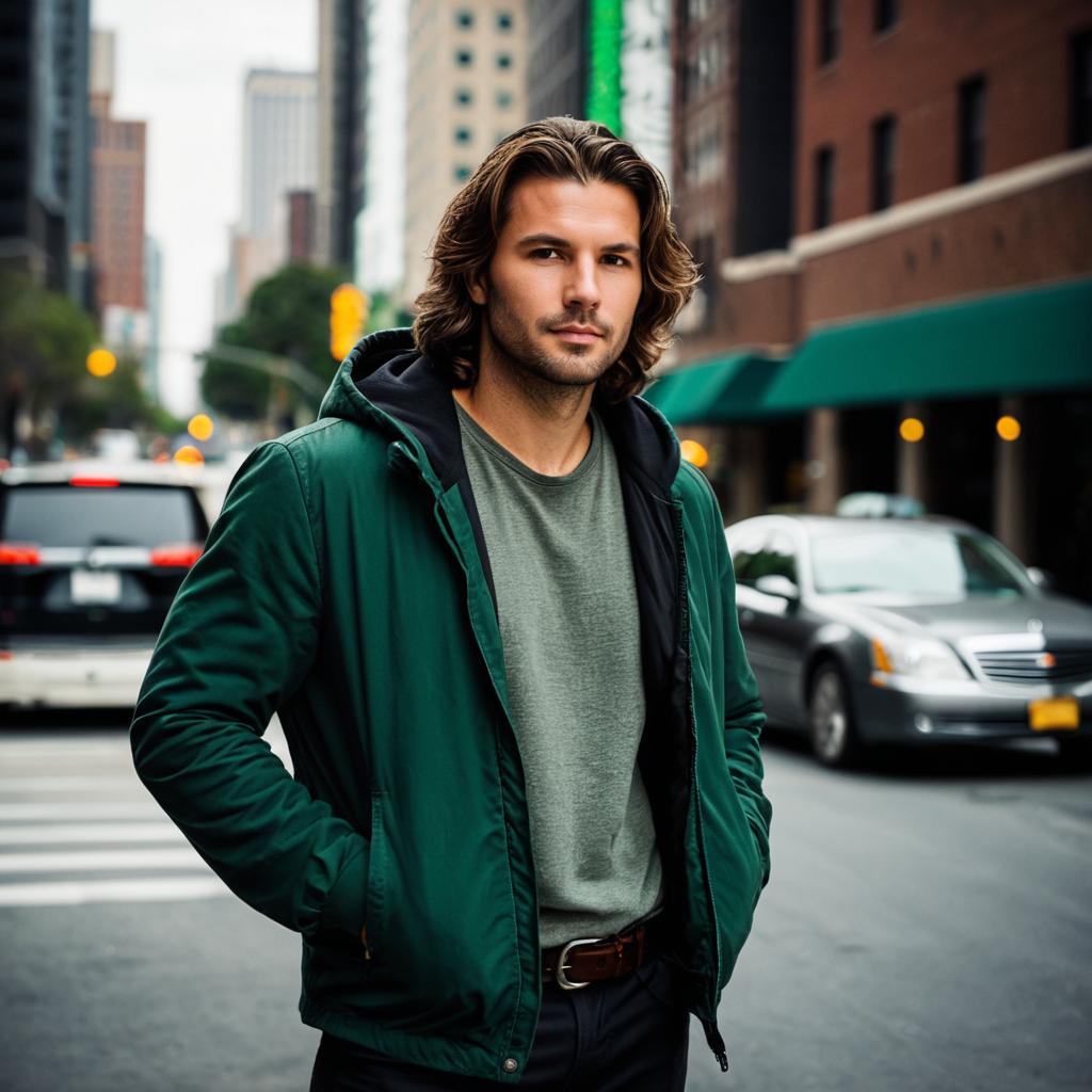 Hollywood movie outfit, photorealistic, male, standing, street, daytime, urban, 30s, handsome, rugged, medium-length wavy brown hair, green eyes, serious expression, casual clothes, dark green jacket, brown hoodie, gray shirt, black pants, black belt, car in background, blurred cityscape, muted colors, natural light, street signs, trash can, slight bokeh effect