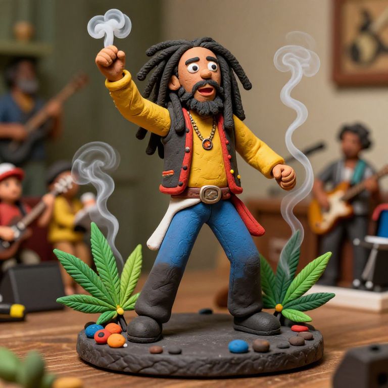 Intricately detailed Bob Marley figurine sculpted from clay, painted in vivid colors with a dynamic pose as if performing on stage, surrounded by swirling smoke and vibrant cannabis leaves, with a backdrop of a lively crowd and musical instruments in a cozy setting.