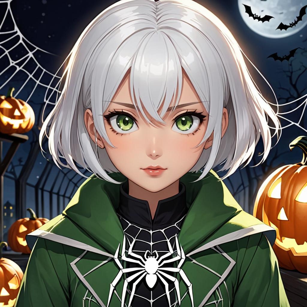 This is a digital anime-style drawing of a young woman with short, white hair and striking green eyes. She wears a green cloak with a black spider emblem in white across her chest and a black spider web pattern on her neck. The background features a dark, moonlit night with a full moon and silhouetted bats. Orange jack-o'-lanterns with glowing faces are placed around her, and a spider web stretches across the scene. Her expression is calm and slightly curious. The overall style is vibrant and detailed, with a Halloween theme.
