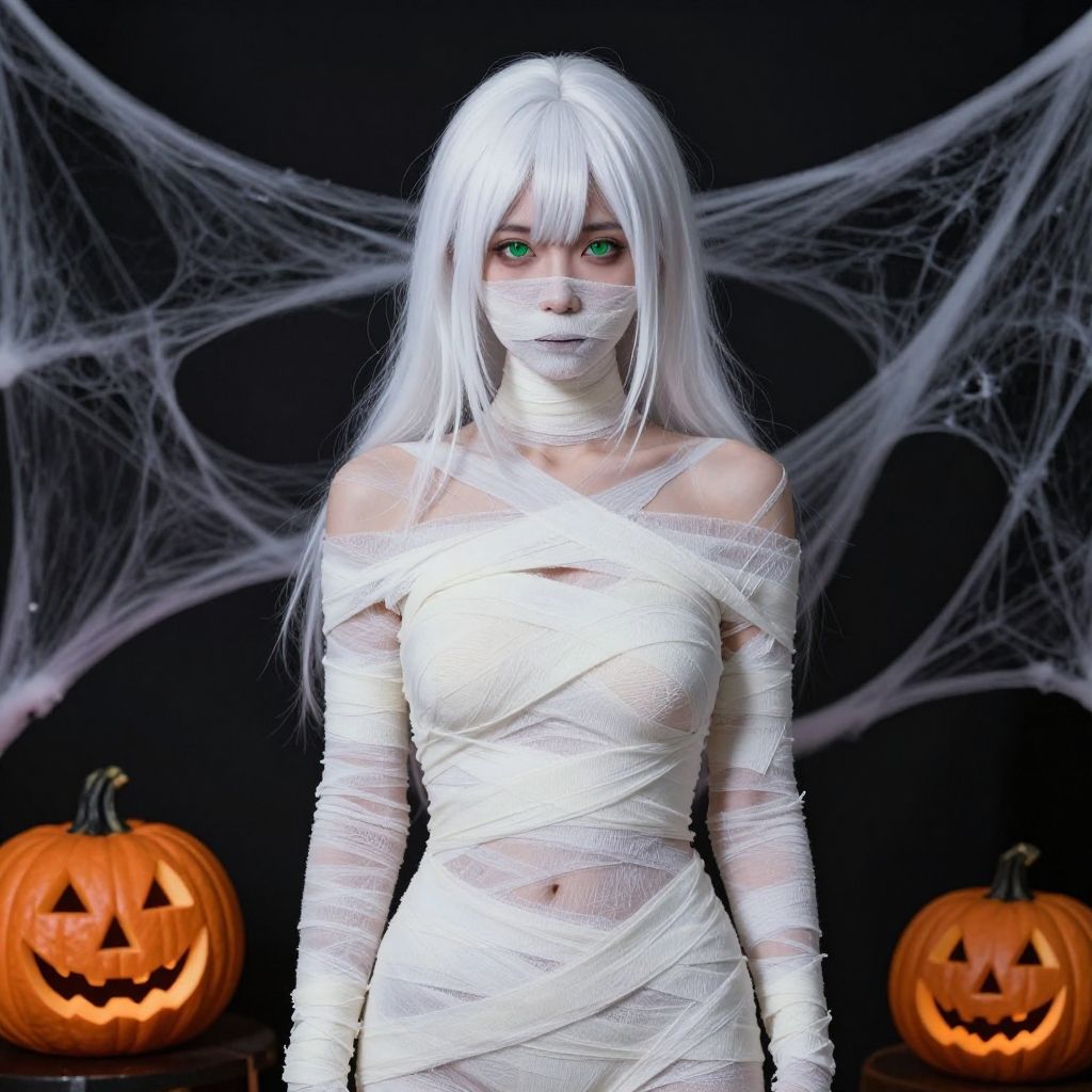 (masterpiece, best quality:1.2), solo, 1girl, expressionless, closed mouth, looking at viewer, white hair, green eyes, coat, naked bandage, night, halloween, jack-o'-lantern, spider web