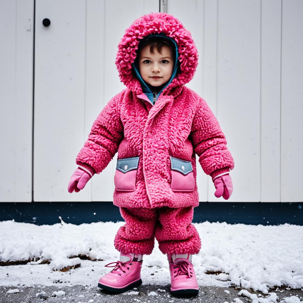 Young toddler boy dressed in a full-body pink poodle-style winter costume with a hood, gloves, and boots, standing on a snowy surface in front of a white wall, looking directly at the camera.