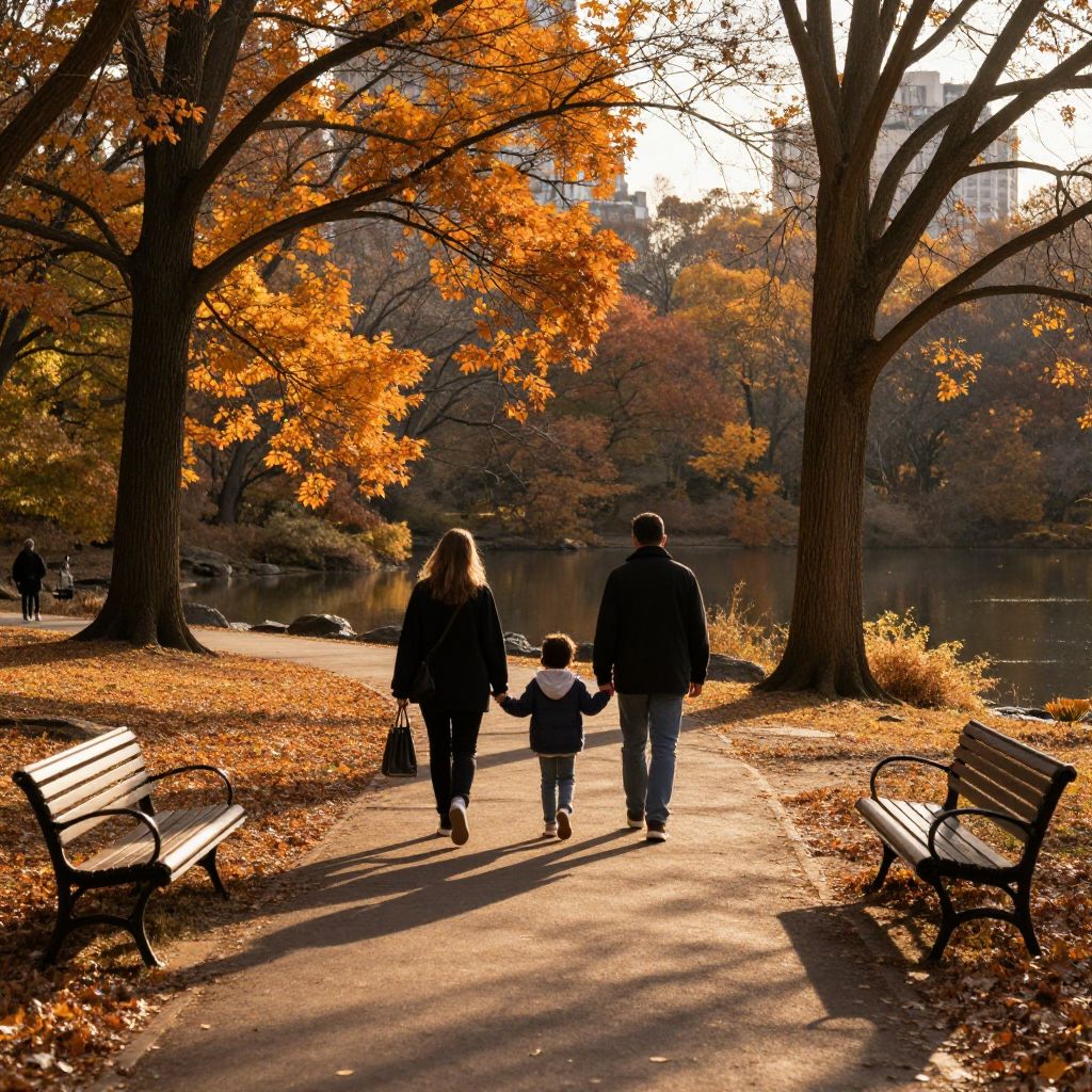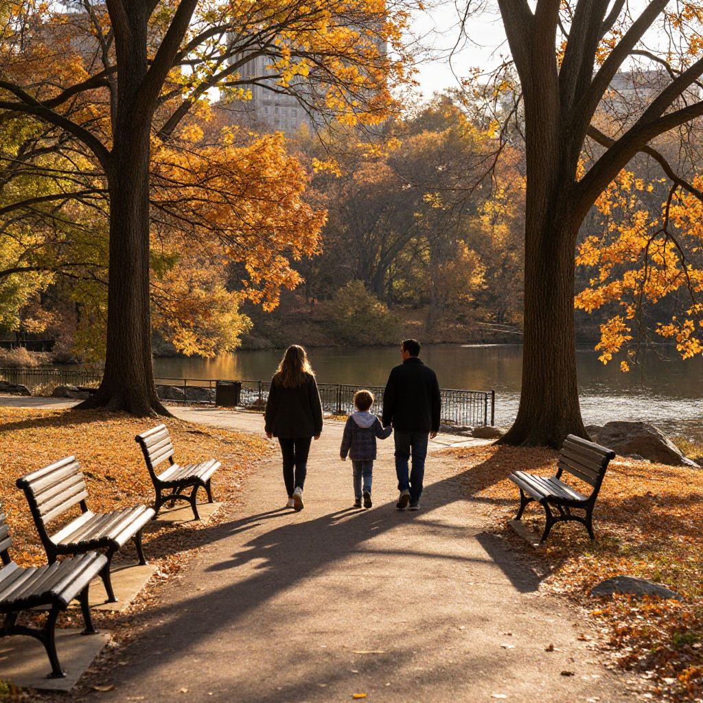 Golden sunlight bathes a serene autumnal scene in Central Park, where three figures—a woman, a child, and a man—walk hand-in-hand along a paved path flanked by benches, fallen leaves, and towering trees adorned with vibrant orange foliage, casting long shadows that stretch toward the tranquil water beyond.