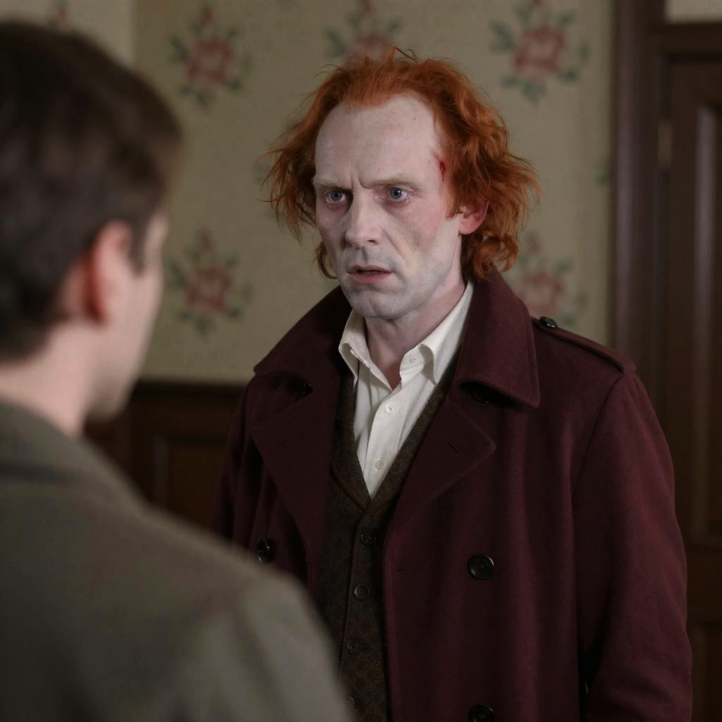 A man with pale skin, wild red hair, and a bald head with a blood streak, intense expression, wearing a dark red coat and white shirt, faces a man with brown hair, blurred in the foreground. Indoor setting with floral wallpaper and wooden furniture.