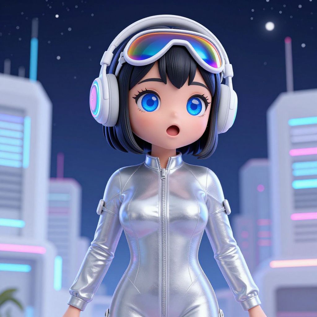 Digital anime-style girl with large blue eyes, short black hair, wearing a silver zip-up outfit, white headphones, and futuristic goggles, stands in a