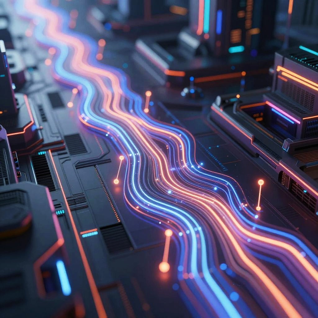 Ai cascade sdxlmichael flowing through a futuristic digital landscape, glowing neon circuits intertwining with cascading data streams, vibrant colors, high-tech and sleek design, cybernetic atmosphere, detailed and dynamic composition