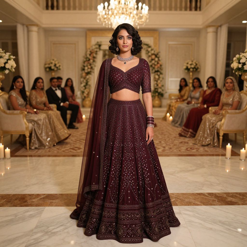 A confident bride in her late 20s with soft black curls and bright green eyes, dressed in a glamorous maroon lehenga with silver thread detailing, posing at a luxury reception inside a spacious villa with marble floors, candlelight, and an elegant seating arrangement for guests in traditional Indian attire.