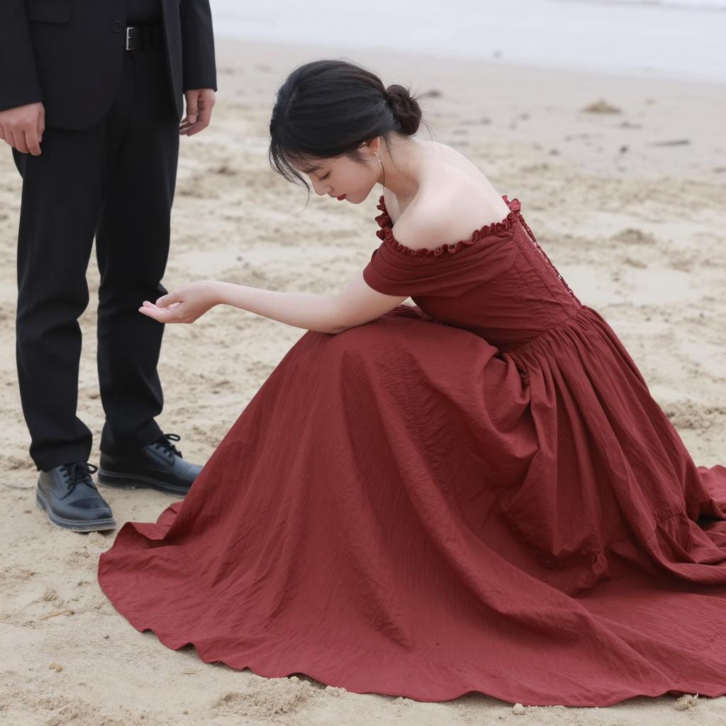 A young woman with dark hair styled in a low bun sits on sandy beach wearing a deep red, off-the-shoulder ball gown with ruffled trim. She leans forward with head down and one arm extended. Next to her stands a man dressed in black pants, black jacket, and black shoes. The beach sand and blurred light-colored background complete the scene.
