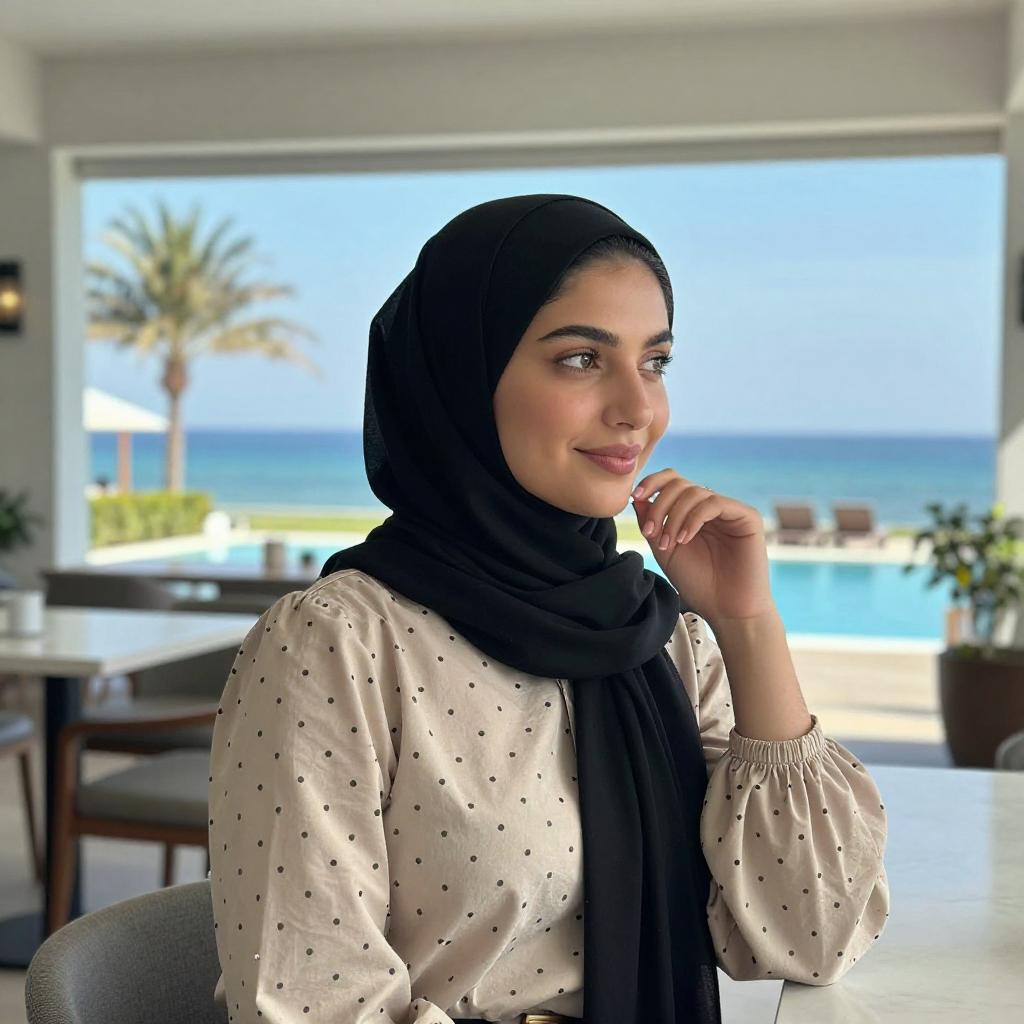 Photograph of a young woman with fair skin and dark hair in a black hijab, wearing a beige, long-sleeved, polka-dotted blouse. She gazes to the right with a slight smile, her right hand near her chin. She stands in a modern outdoor cafe with large windows, overlooking a bright blue ocean and pool area with palm trees and lounge chairs.