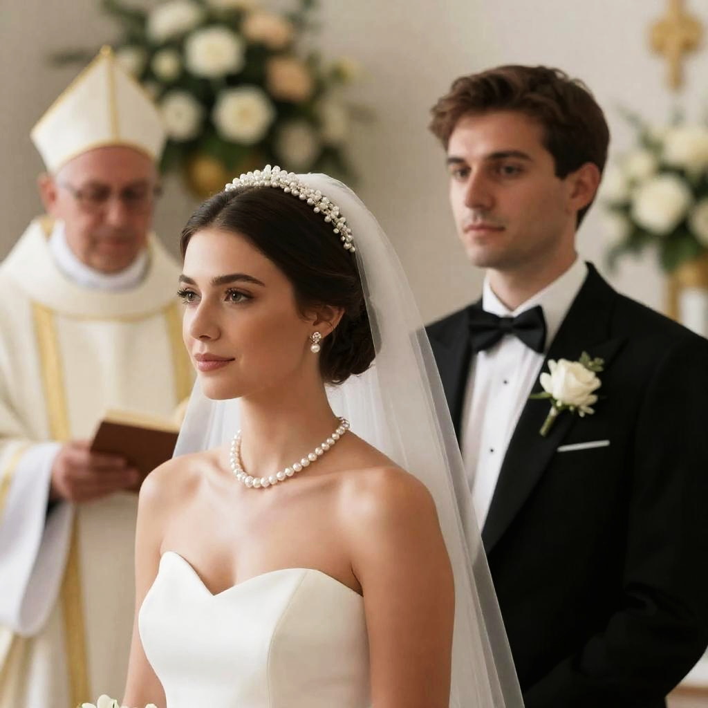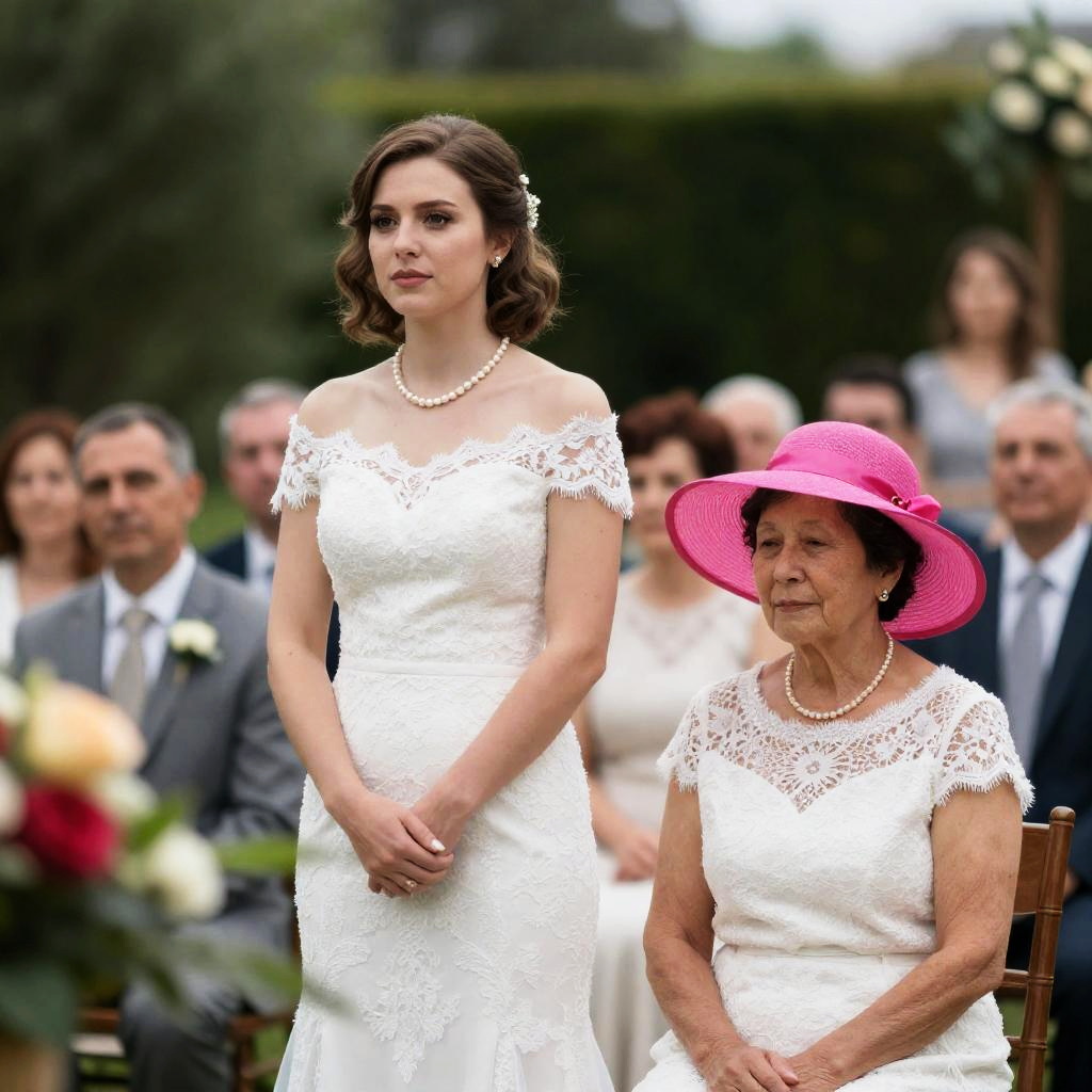 Bride in white wedding dress and veil, holding white bouquet, sitting on white chair, green lawn background, people standing, white flower arrangements, soft sunlight, groom's back visible, serious expression, short blonde hair, pearl necklace, floral accents.
