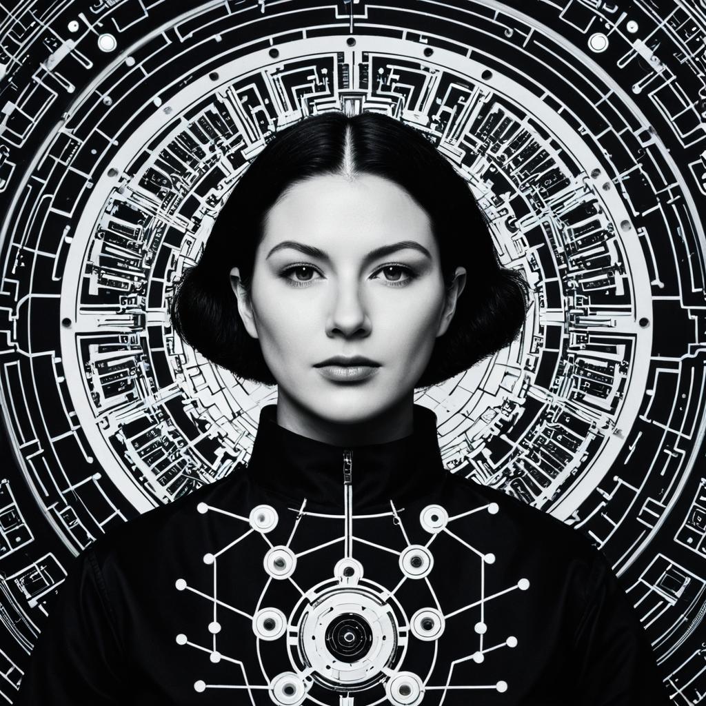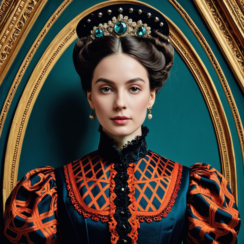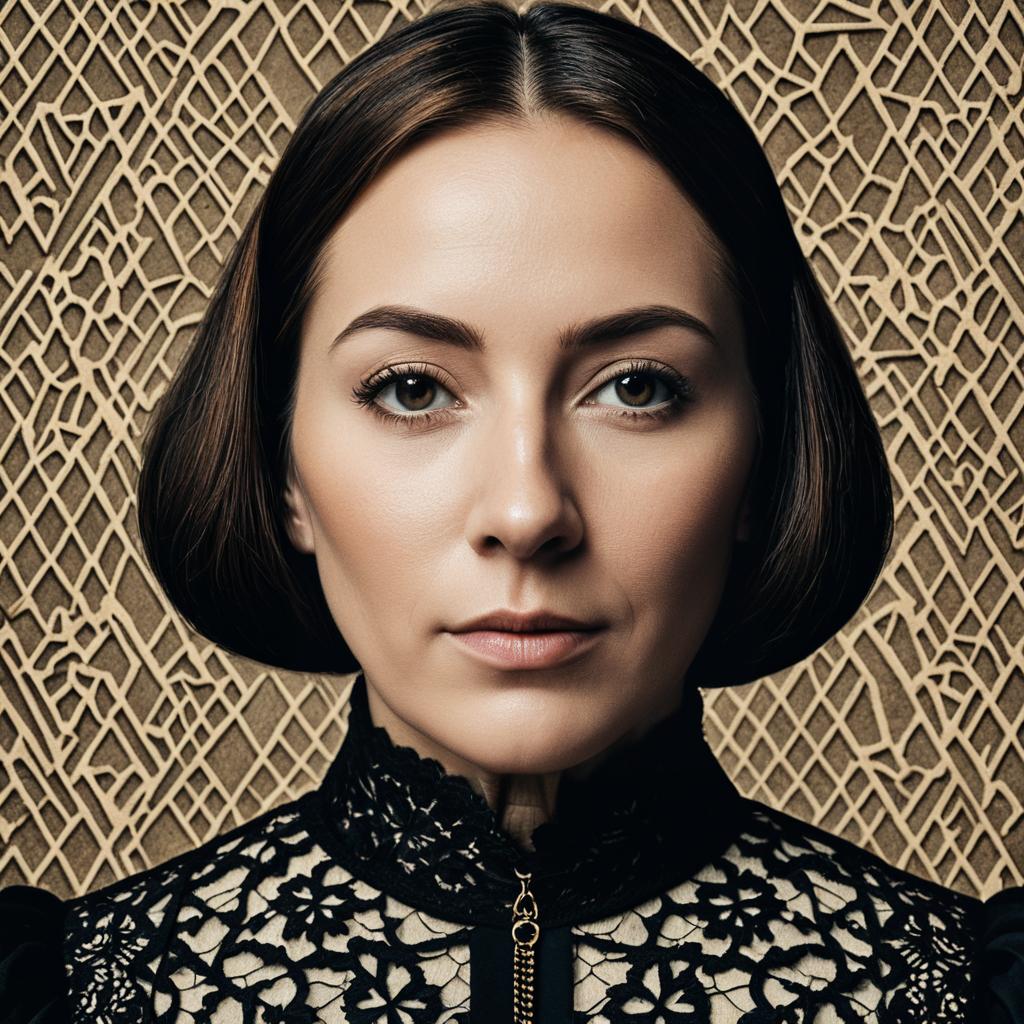 Hyperrealistic portrait of a middle-aged woman blending Gothic and contemporary styles, inspired by Hans Holbein, muted earth tones, abstract geometric shapes, delicate lace patterns, surreal distortion, vivid details, and high resolution.