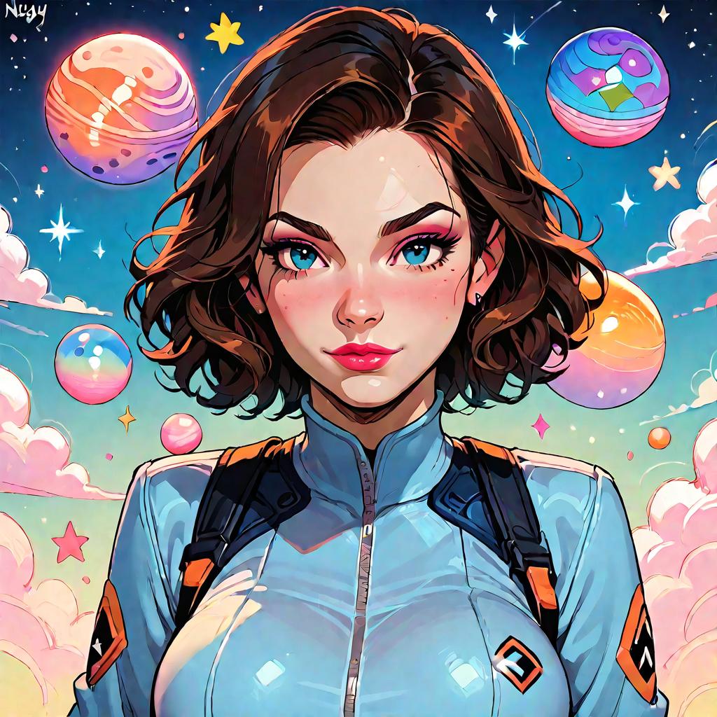 Score_9, score_8_up, score_7_up, score_6_up, score_5_up, score_4_up, stars, aimee_brightower, blue eyes, brown hair, blue bodysuit, planet logo, solo, lipstick, makeup, eyeshadow, large breasts