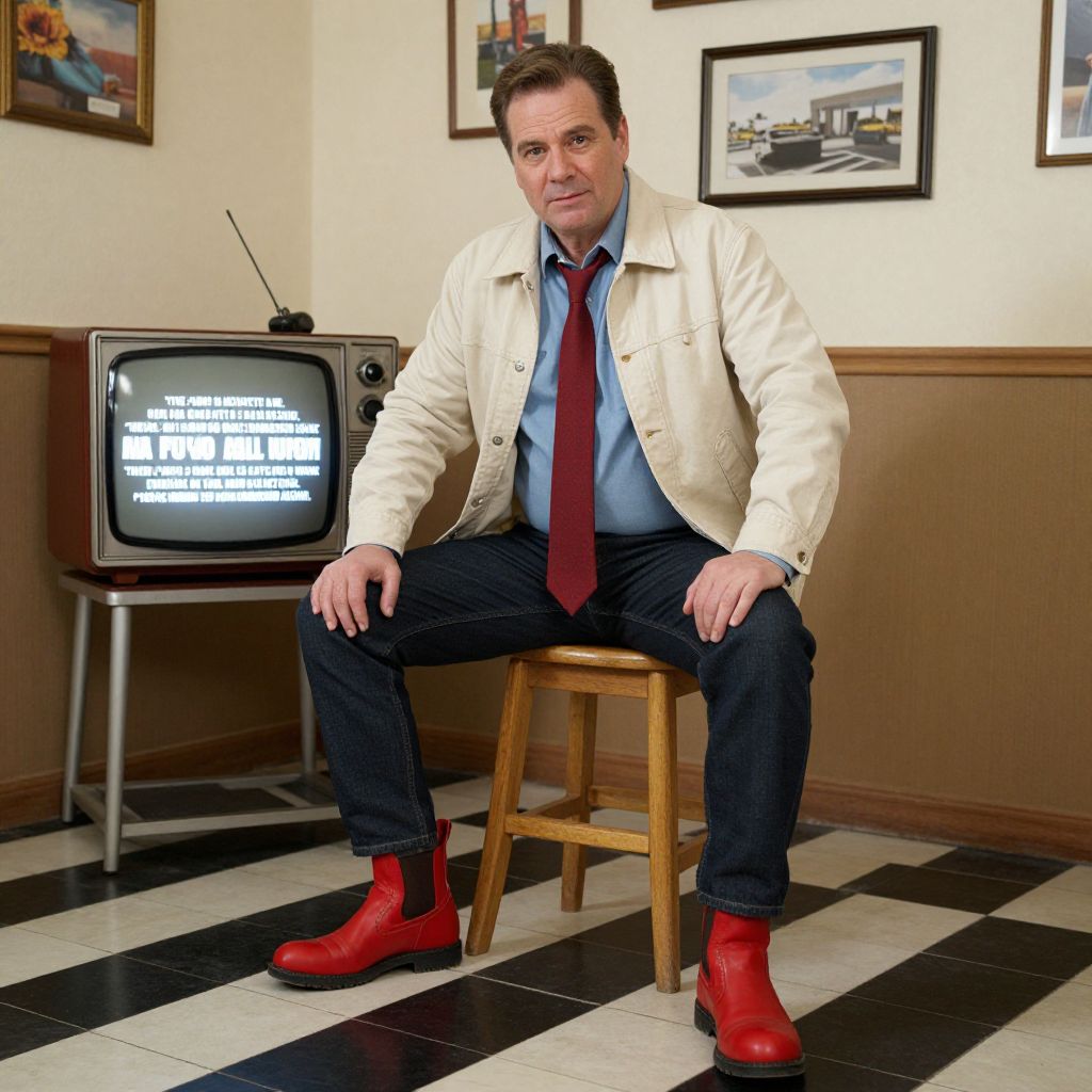 A photograph of a middle-aged man with short brown hair, sitting on a wooden stool in a retro-style room with black and white checkered floors. He's wearing a cream jacket, blue shirt, red tie, dark jeans, and red boots. Behind him is an old-fashioned TV displaying white text, and framed pictures on the wall. The room has a cozy, vintage vibe.