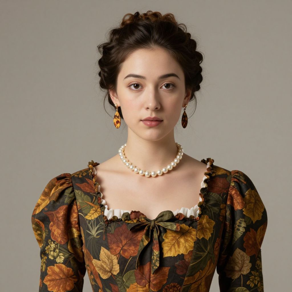Photograph of a young woman with pale skin and brown hair styled in an elegant updo. She wears a Victorian-style dress with a black background adorned with vibrant orange and yellow autumn leaf patterns. Her dress has puffed sleeves and a square neckline. She is accessorized with a pearl necklace and dangling autumn leaf earrings. Her expression is neutral, and she gazes directly at the camera. The background is a solid, muted gray, making her the focal point. The overall style is classic and formal.