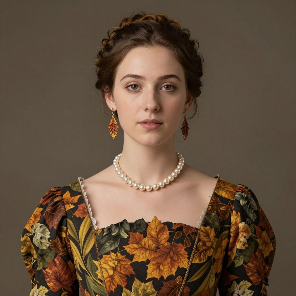 A digitally rendered portrait featuring a woman adorned in a Victorian-inspired dress with autumnal leaf patterns, complemented by a classic pearl necklace and matching earrings, evoking the timeless elegance reminiscent of Vermeer's style with a modern, high-definition twist.