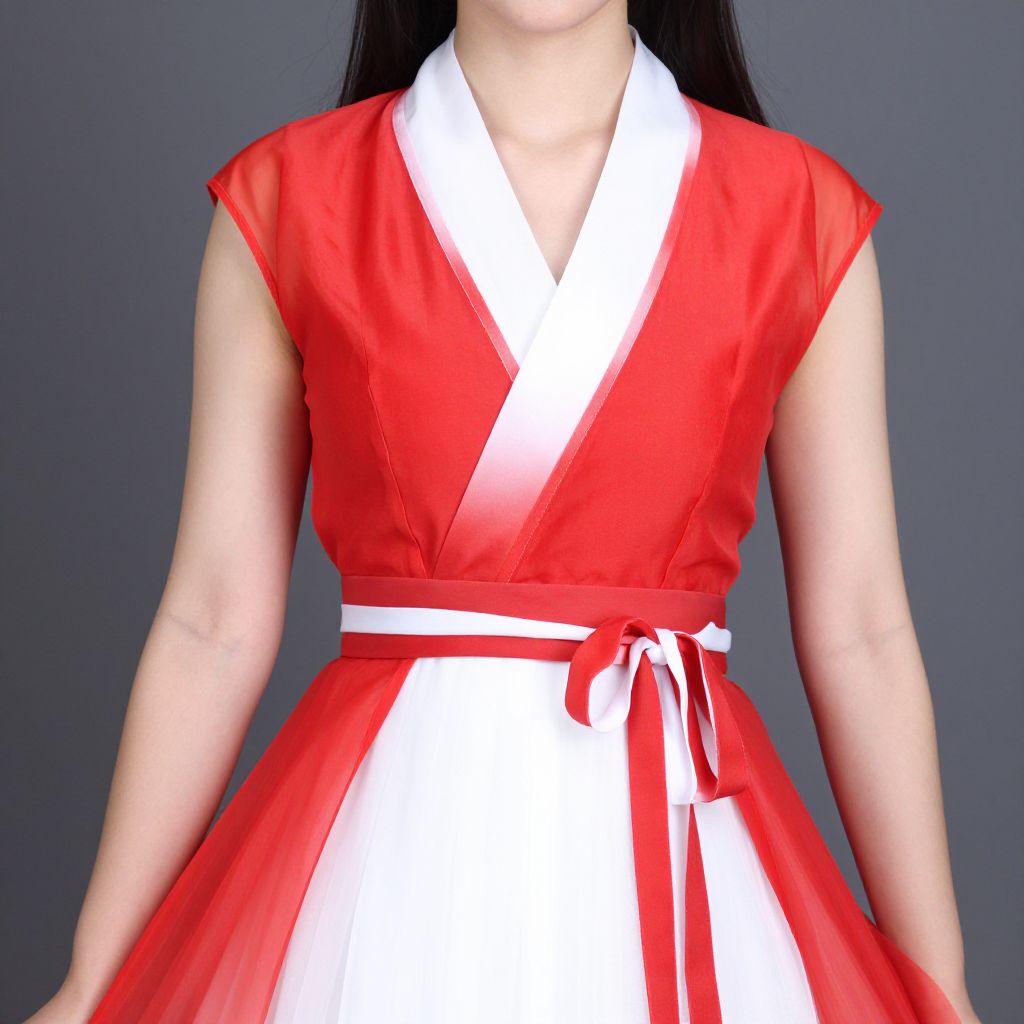 "Upper Wear Woman Costume, asian woman in a red and white dress with a red and white sash"