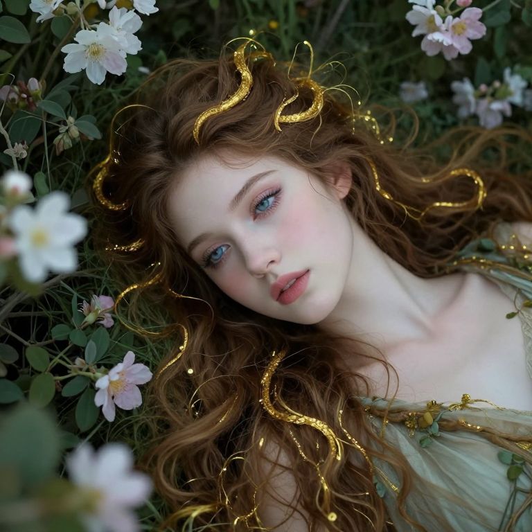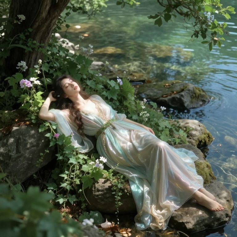 Craft an image reminiscent of enchanting Victorian-era paintings with a unique 'bird's-eye view' perspective overlooking a serene scene on a rocky shore. In the foreground lies a beautiful ethereal maiden adorned in shimmering robes, resting gently against lush greenery and crystal-clear waters. Soft sunlight filters through the trees, illuminating her face as delicate flowers and ivy tendrils surround her, creating an enchanting atmosphere of tranquility and wonder. The nymph appears lost in deep contemplation, capturing the essence of timeless beauty and mystical allure within a masterfully composed scene.