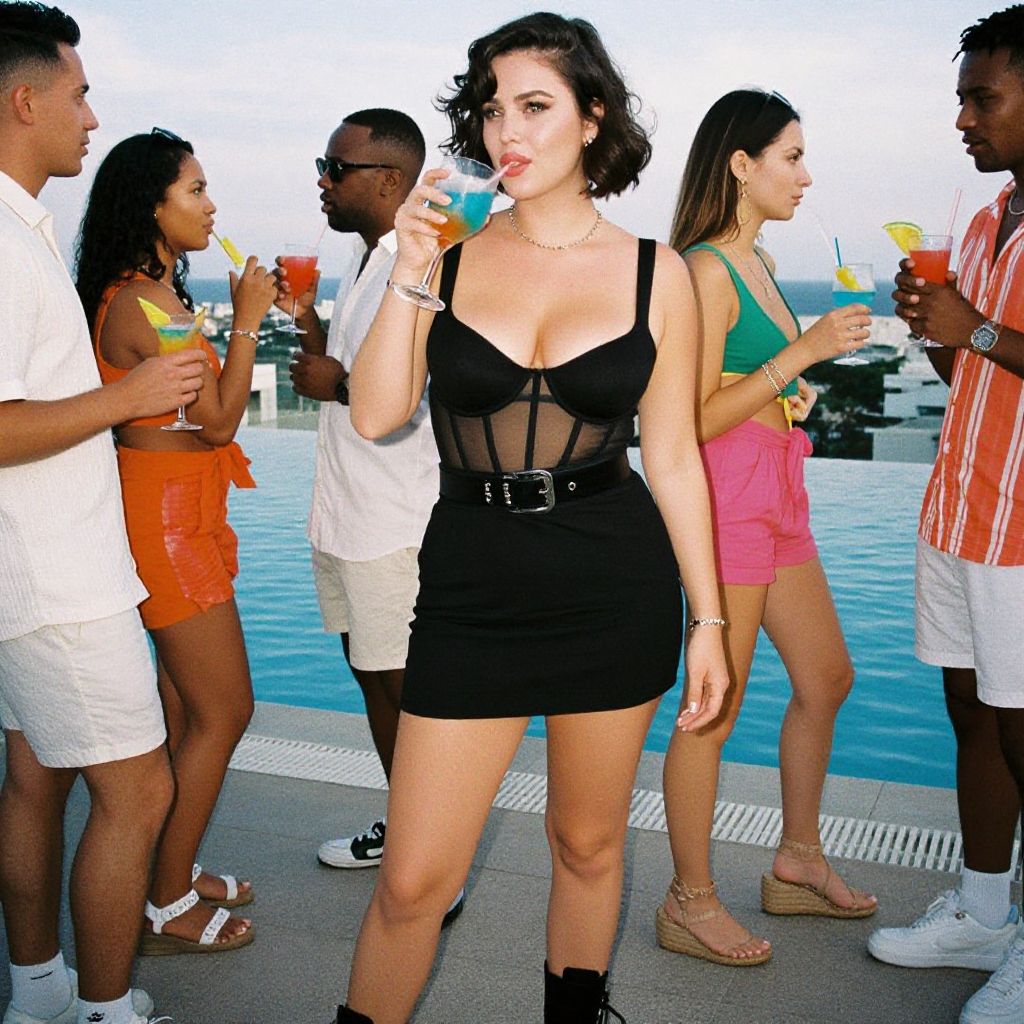 A stocky woman in a modern chic black mini dress with a sheer chest panel and fitted waist stands at a rooftop infinity pool party, enjoying the vibrant atmosphere. Her short wavy hairstyle and chunky black ankle boots complement the technicolor analog film stock visual style, as she mingles with friends, sipping a colorful cocktail. Sexy. Pretty face and beаutiful eyes. Big breasts