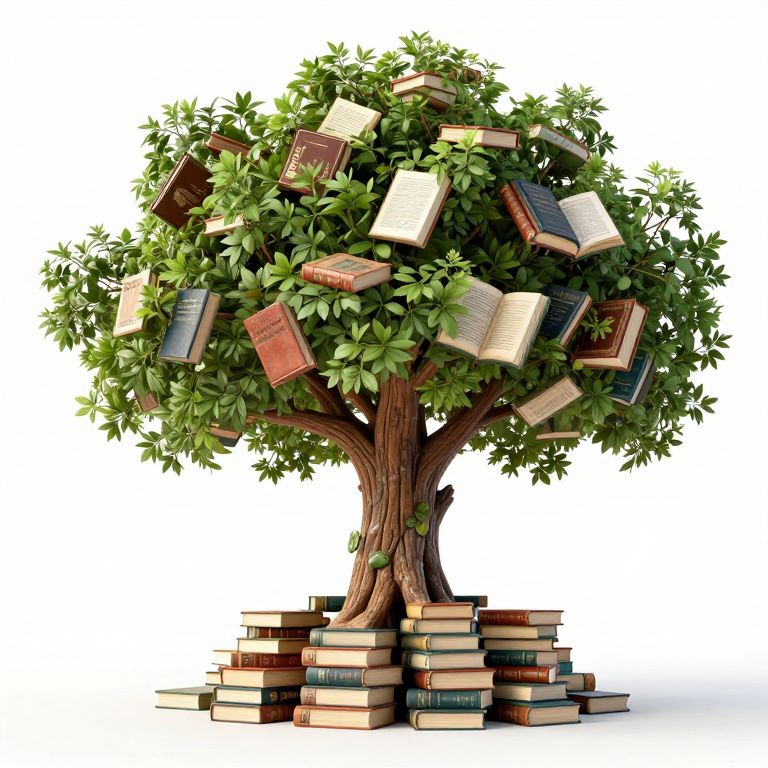 A surreal tree emerges from a stack of books, its branches adorned with volumes that seamlessly blend into the foliage, creating a living library where knowledge and nature intertwine.