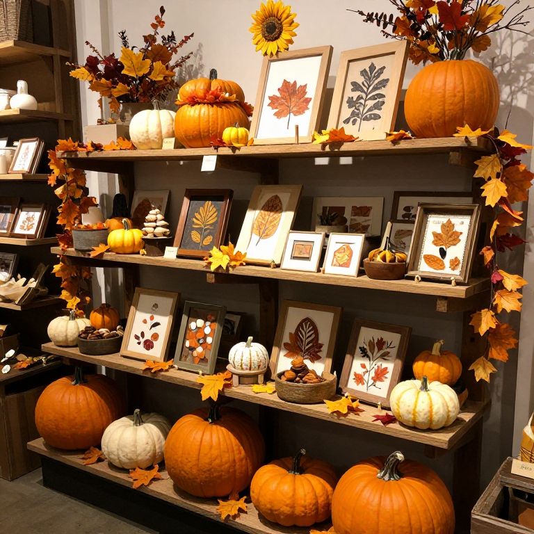 Photograph of a warmly lit, autumn-themed display shelf in a store. The shelf, dark wood with three levels, is adorned with large, orange and white pumpkins, some with glittery finishes. Autumn leaves and sunflowers decorate the top. Framed artworks featuring fall leaves and botanical prints are arranged on each level. The background includes more shelves and a white wall. The overall color scheme includes warm oranges, whites, and browns, evoking a cozy fall atmosphere.