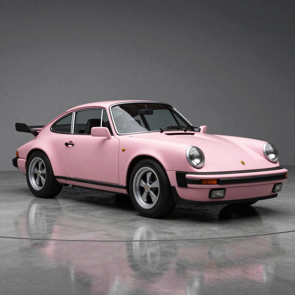 Classic Porsche 911 baby pink in a minimalist garage setting, soft ambient lighting, polished concrete floor, intricate details of the car's body and rims, clean lines and smooth textures, ultra-realistic render with a hint of retro charm