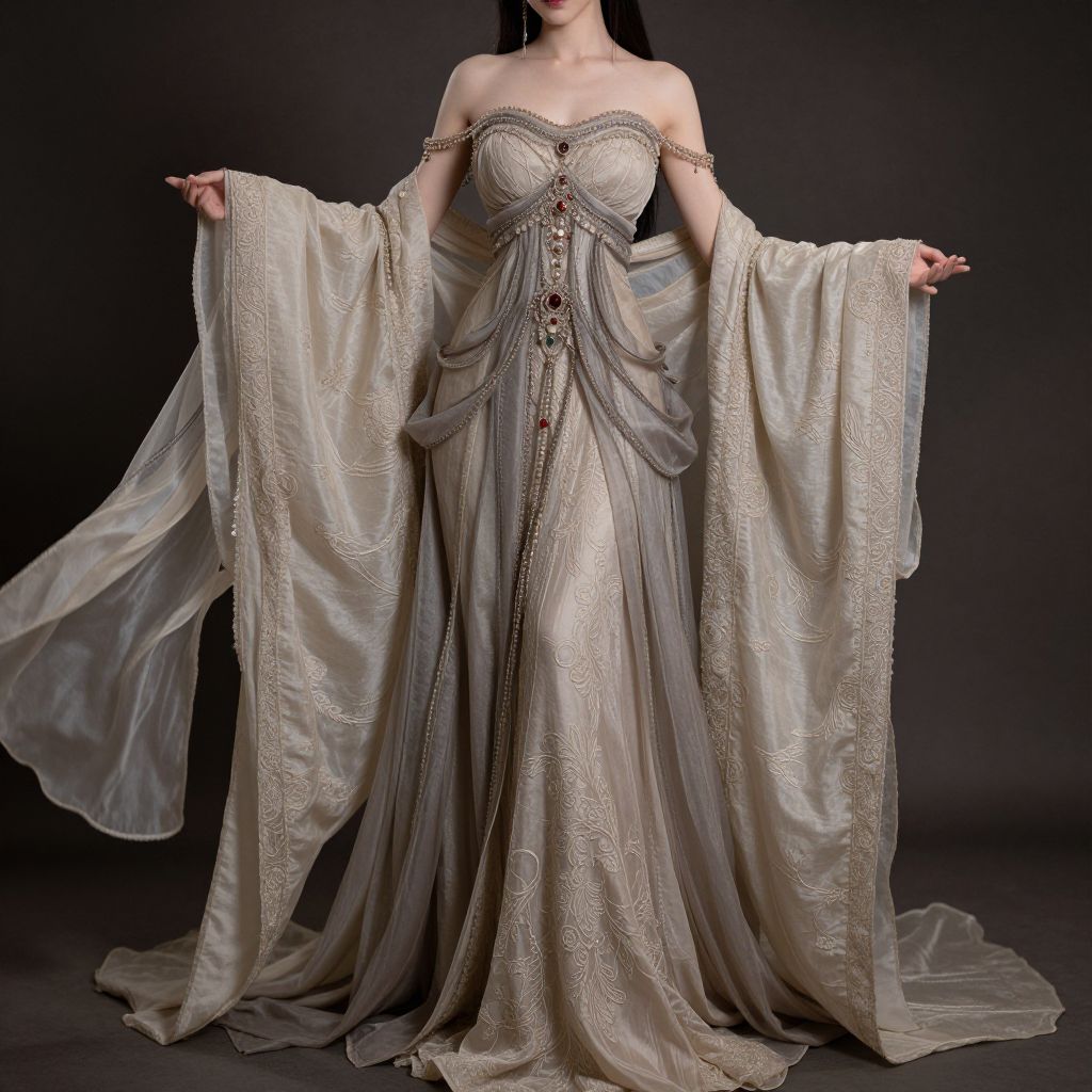 Photograph of a woman in an elaborate, off-the-shoulder, strapless gown with wide, flowing sleeves. The dress is made of delicate, shimmering beige fabric adorned with intricate lace and beadwork. The bodice is fitted, accentuating her waist, with a dramatic, gathered, and beaded center. Her long, dark hair cascades down her back. She holds out the sleeves gracefully. The background is solid black, highlighting the dress's intricate details and elegant design. The overall style is reminiscent of vintage or medieval fashion, with a luxurious and regal aesthetic.