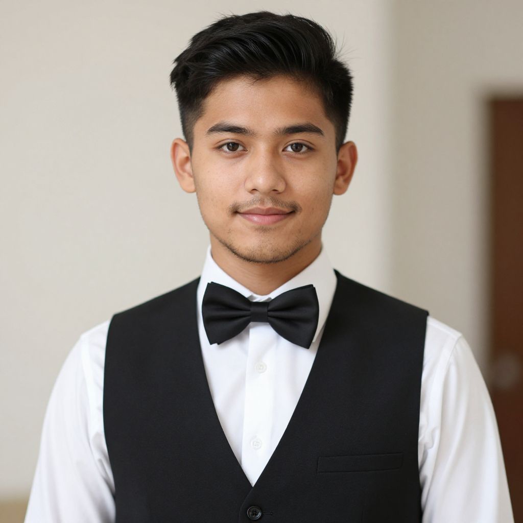 Photograph of a young Asian man with medium skin tone and short black hair, wearing a straw hat and a black Hawaiian shirt adorned with blue, white, and green floral patterns. He has a pink, white, and yellow flower lei around his neck. The background features a blurred outdoor setting with green grass and palm trees. The man is smiling slightly, standing center-frame, exuding a relaxed, tropical vibe. The photograph is brightly lit, emphasizing the vivid colors of his attire and lei.