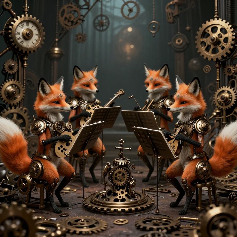 In a steampunk dreamscape, a mechanical ensemble of anthropomorphic foxes, clad in intricate gears and cogs, performs a hauntingly precise symphony that echoes through the ages, blurring the boundaries between time and eternity while evoking a bittersweet longing for the unattainable harmony of existence.