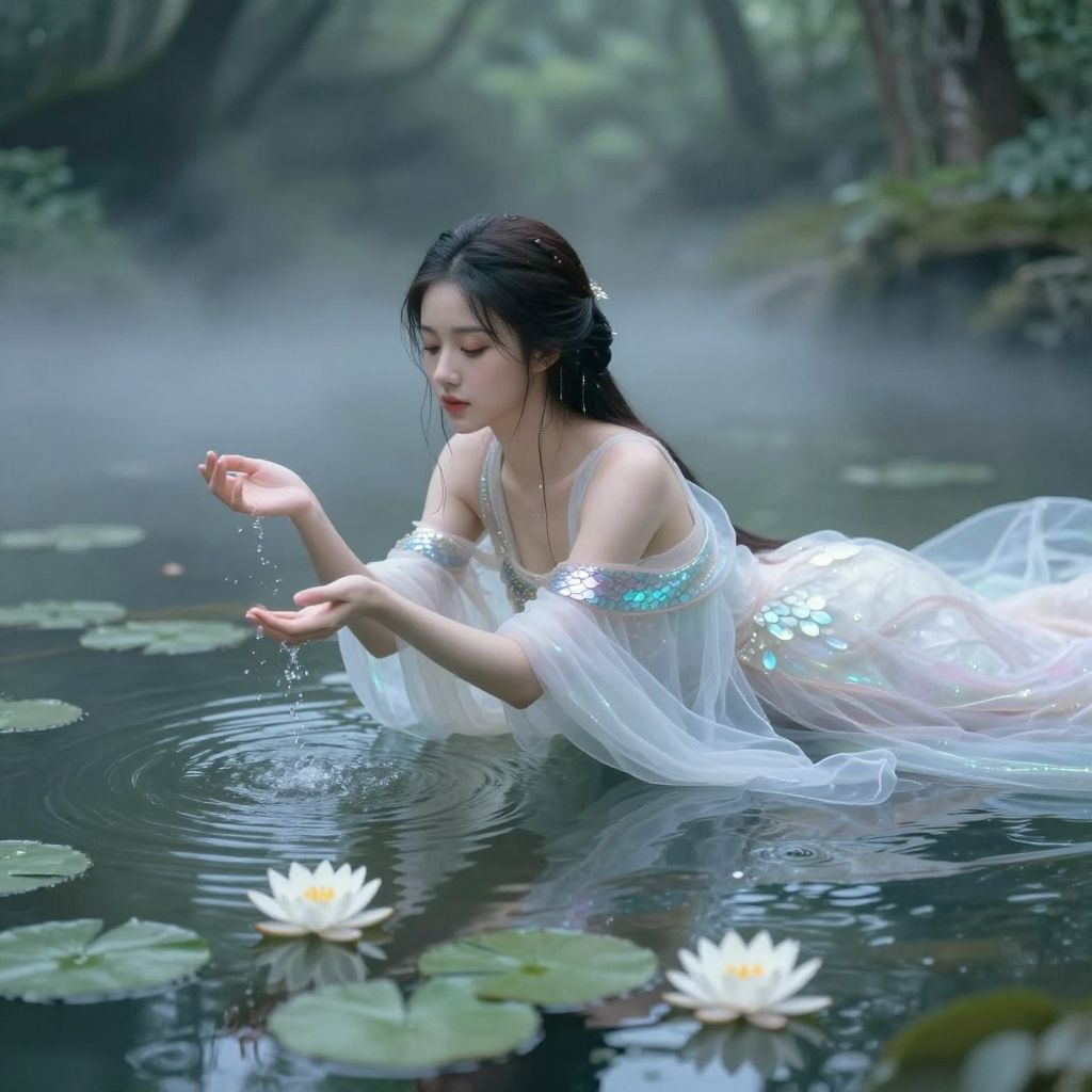 Photorealistic digital artwork of an Asian woman with long black hair adorned with a white flower, wearing a sheer, white, flowing robe, floating in a serene, misty pond. She extends her right hand gracefully above the water, with droplets gently falling from her fingers. Her left hand is open and slightly submerged. The pond has lily pads and white water lilies, with lush greenery in the background. The soft, ethereal light illuminates her delicate features and the translucent fabric of her robe, creating a tranquil, almost mystical atmosphere.
