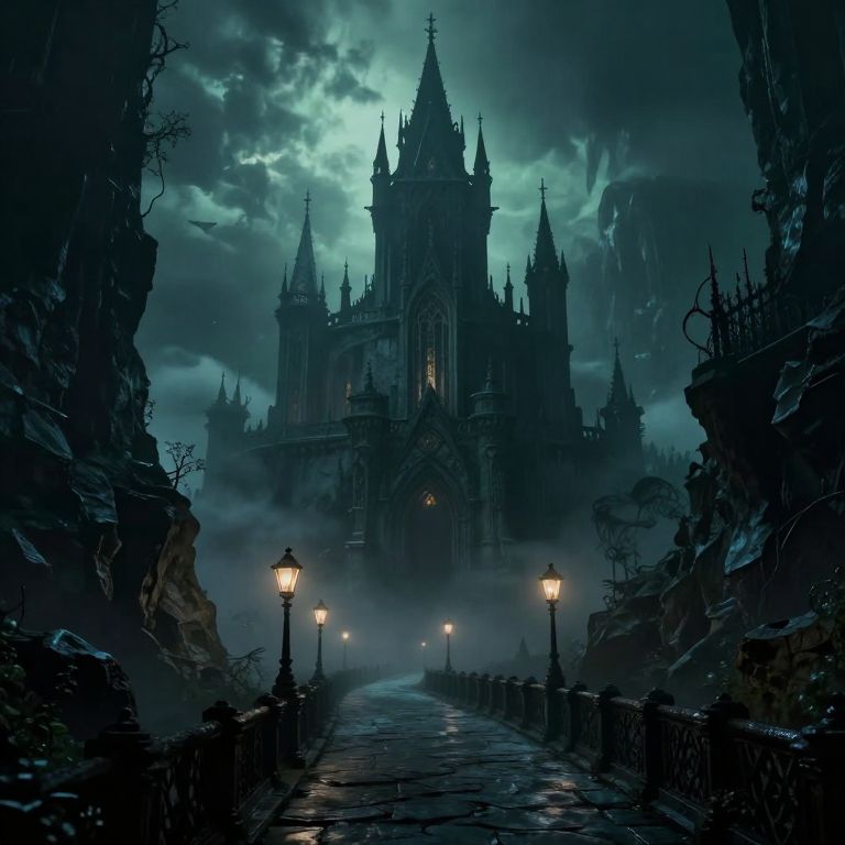 The image depicts a dark, gothic landscape with a towering, ominous castle shrouded in mist. The castle, with its spires and intricate architecture, stands majestically in the center, its silhouette illuminated by the soft glow of street lamps lining the winding path leading up to it. The path, flanked by rocky cliffs, curves gently towards the castle, creating a sense of depth and mystery. The overall color palette is dominated by dark blues and greens, enhancing the eerie and foreboding atmosphere. The scene is reminiscent of a dungeon and dragons setting, with its dark, foreboding ambiance and the castle's imposing presence. The interplay of light and shadow, along with the intricate details of the castle's architecture, adds to the sense of grandeur and mystery.