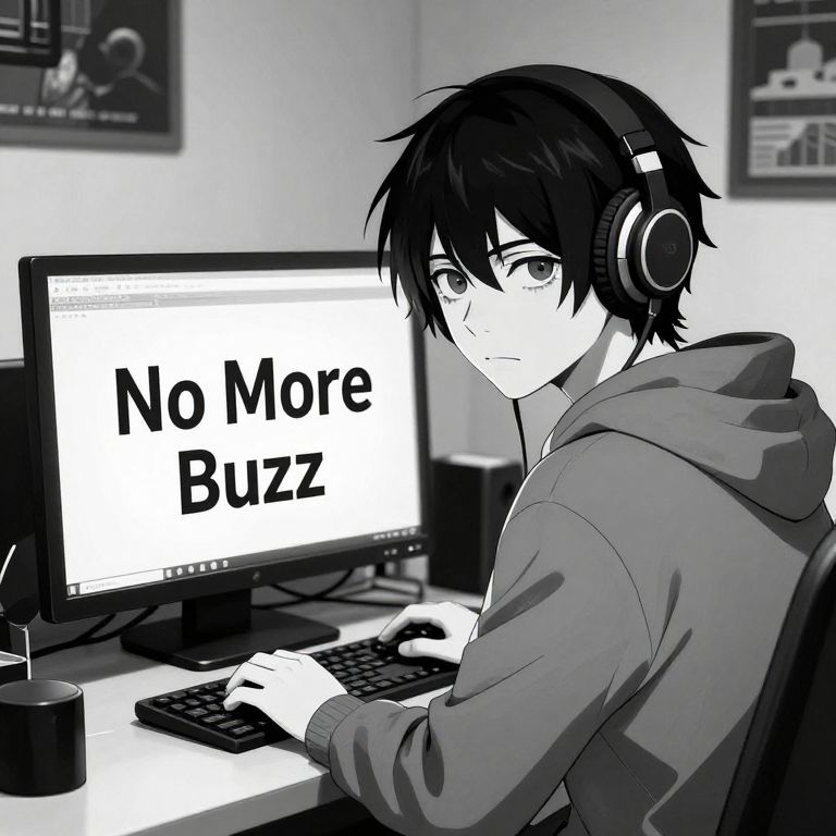 A monochrome picture int he style of Junji Ito's Uzumaki, A Video Game Streamer wearing a hoodie and headphones sits in front of a computer in monochrome jitostyle, He's staring back at the viewer with a dead look in his eyes, On the screen of the computer is a message that says \"No More Buzz\" in bold letters