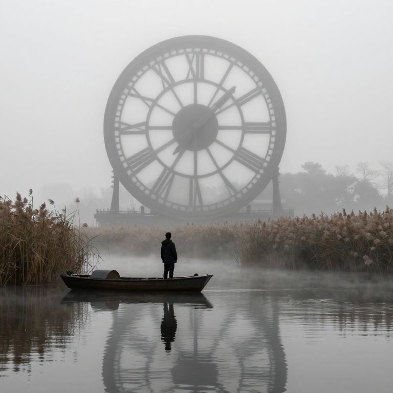 Photograph of a misty, tranquil scene featuring a large, imposing clock face in the background, partially obscured by fog. In the foreground, a solitary figure stands in a small wooden rowboat on a calm, reflective water surface. The person is dressed in dark clothing, silhouetted against the mist. Surrounding the water are tall, brownish reeds. The clock's large Roman numerals and metal structure are visible, creating a striking contrast with the misty, soft light. The overall mood is serene and slightly mysterious.