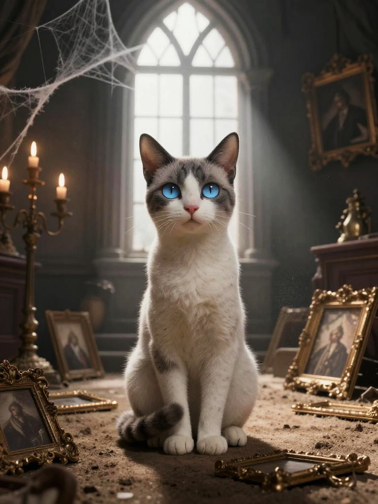 Digital artwork of a white and gray cat with striking blue eyes, sitting in a dimly lit, Victorian-style room. The cat is centered, with a web in the top left corner and sunlight streaming through a large arched window in the background. Framed pictures and ornate candlesticks are scattered around the cat on a dusty, cluttered floor. The cat's fur is smooth and well-groomed, with a small black spot on its forehead and black ears. The room has a mysterious, slightly eerie atmosphere, enhanced by the soft, diffused light and shadows.