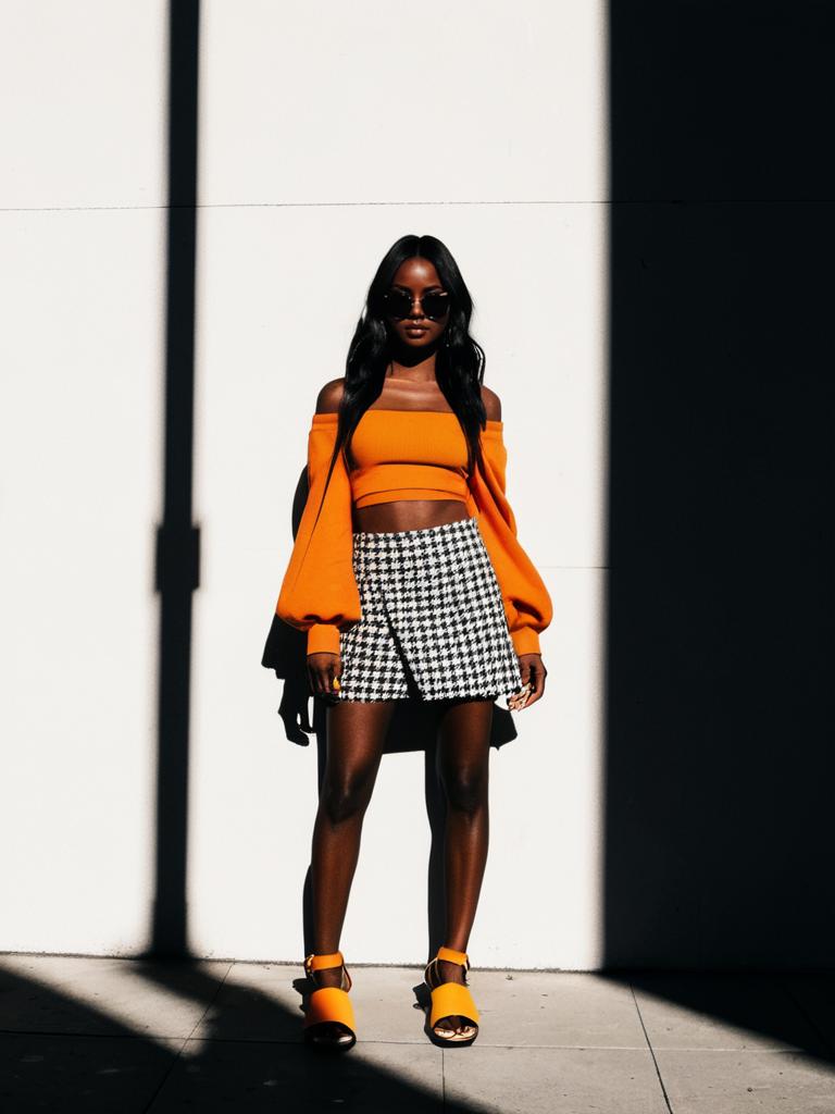 Stylish black woman wearing a black off-the-shoulder crop top with puff sleeves paired with a houndstooth patterned wrap mini skirt featuring an asymmetrical hem. She is also wearing yellow slide sandals and standing against a white backdrop with strong shadow contrast. The look highlights modern street fashion trends.