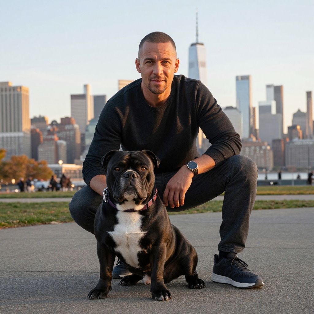 Photograph of a muscular, light-skinned man with a close-cropped beard and short hair, squatting in a park. He wears a black long-sleeve shirt, dark jeans, and black sneakers with white soles. In front of him sits a black and white English Bulldog with a stocky build, looking directly at the camera. The background features a cityscape with tall buildings and the iconic Empire State Building illuminated against a clear blue sky. The park has green grass and a concrete pathway. The man wears a black wristwatch on his left wrist.