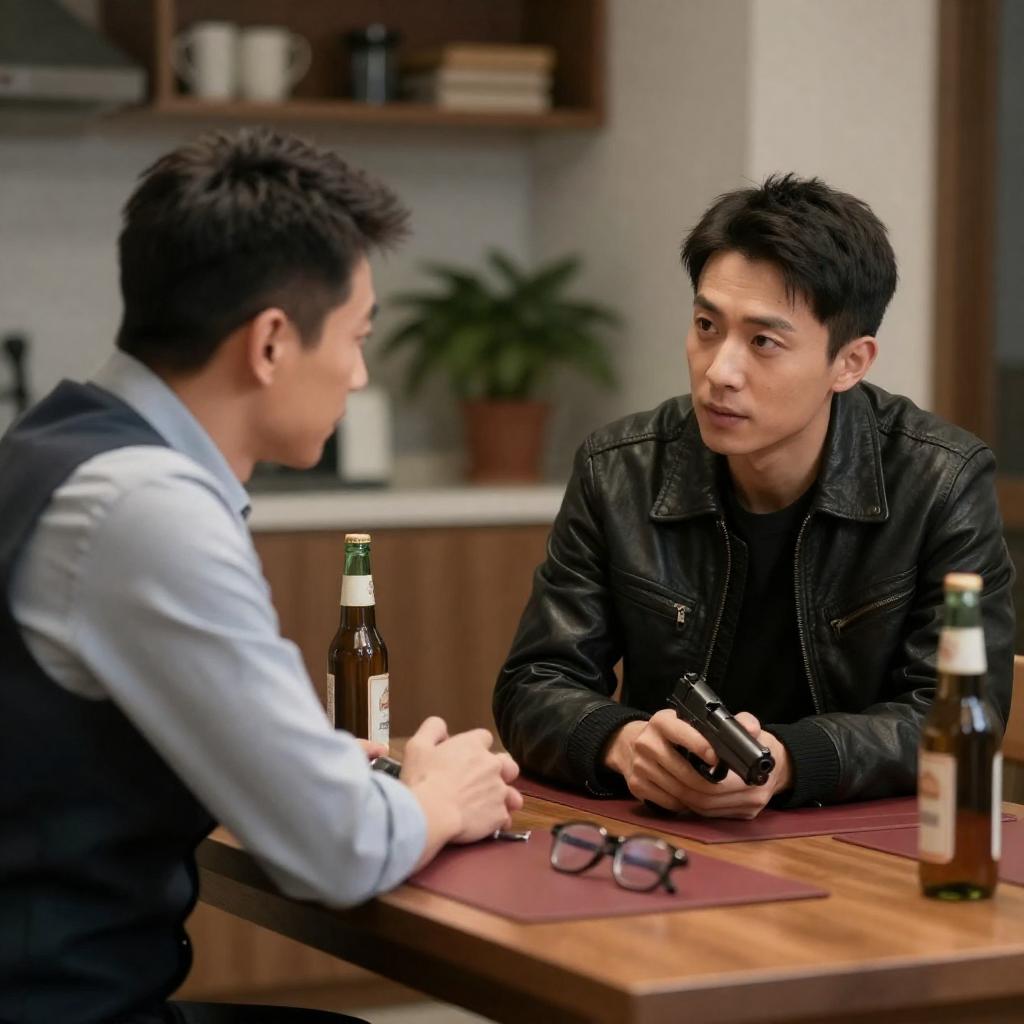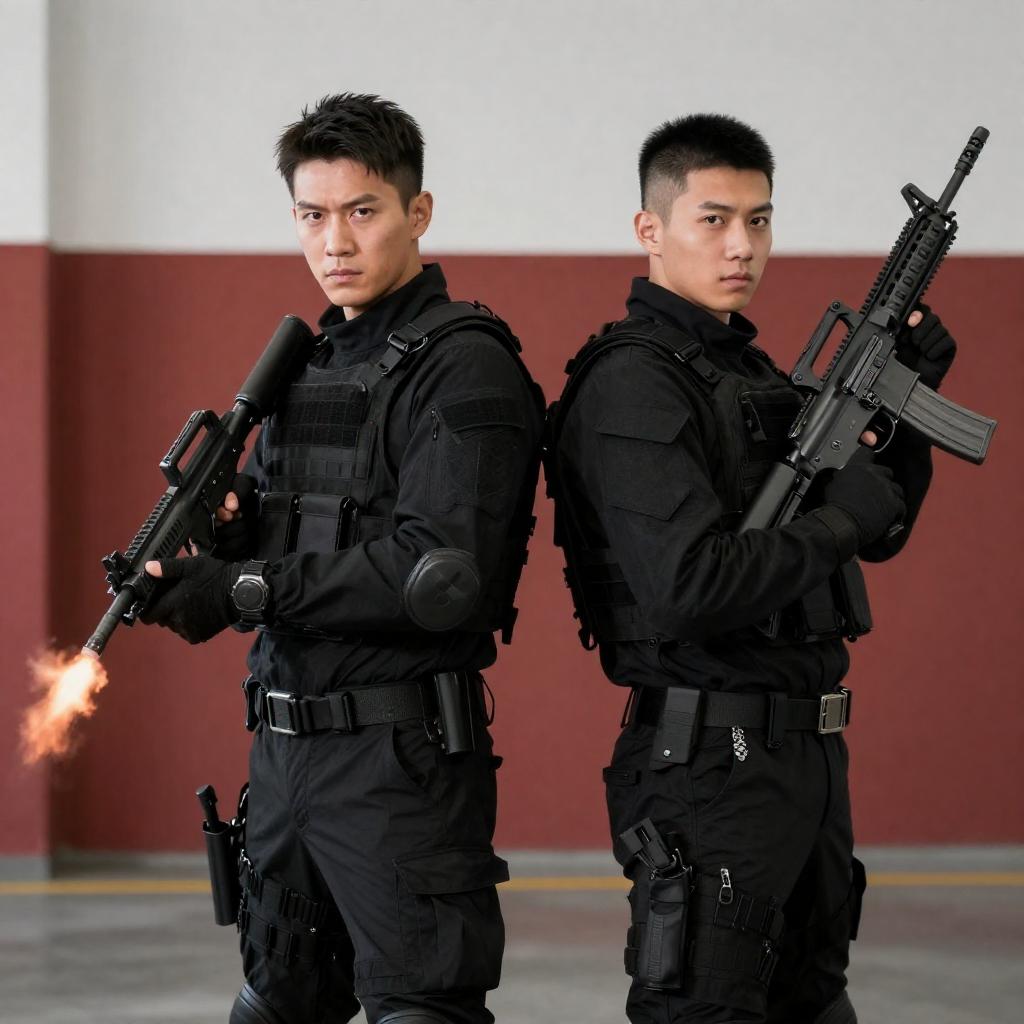 Photograph of two men standing outdoors in a desert-like setting. The man on the left wears a black tuxedo with a white shirt and black bow tie, looking at the man on the right. The man on the right wears a black tactical outfit with a backpack and gear, facing the man in the tuxedo. Both men have short, dark hair. The background is a blurred, sandy landscape.