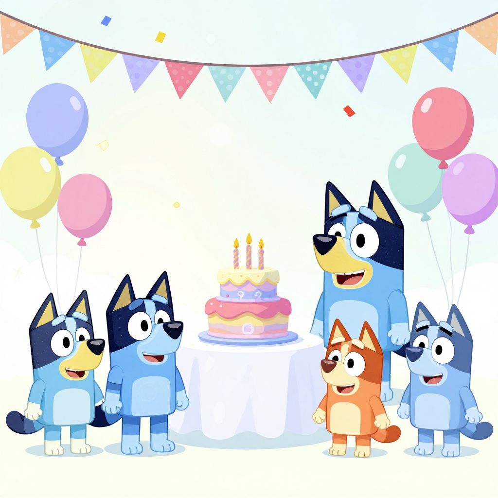 Bluey birthday wallpaper depicting a joyful and festive children’s party scene featuring Bluey characters, colorful balloons floating in the air, a multi-tiered birthday cake, decorative flags hanging overhead, and bright confetti over a soft glowing background.
