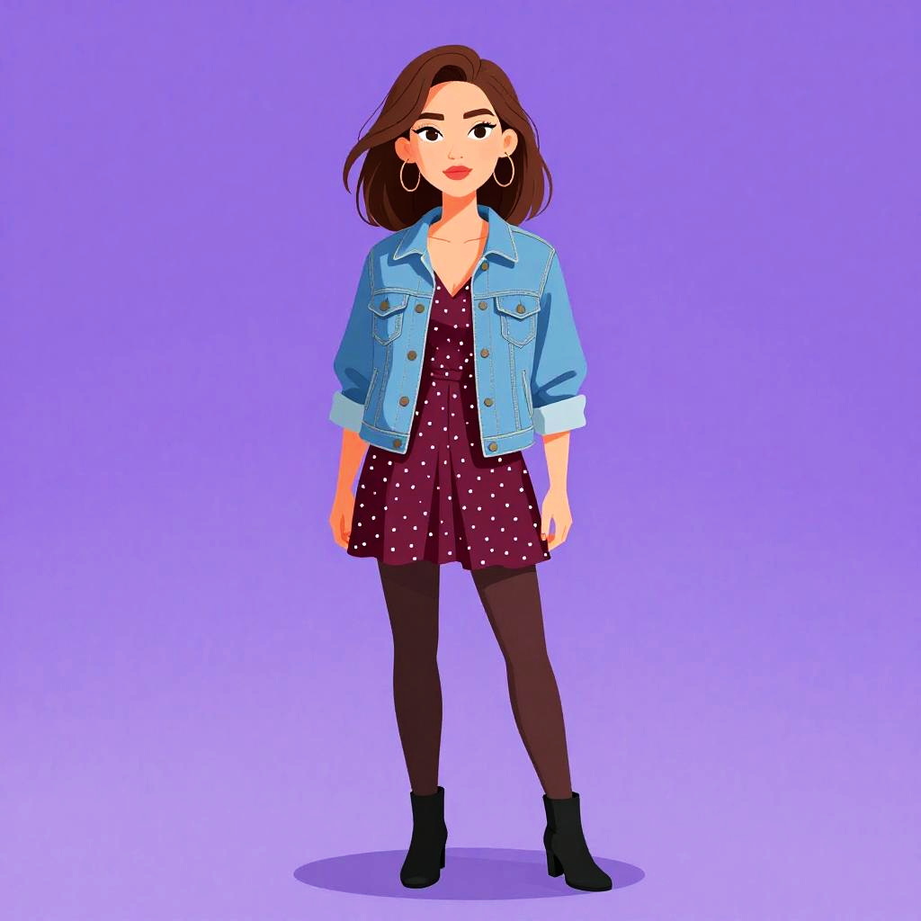 Woman with pretty face and pretty hair. Woman, casual chic, burgundy dress with small white polka dots, V-neckline, front button details, short flutter sleeves, above-the-knee hemline, black tights, relaxed-fit light denim jacket, rolled-up sleeves, chest pockets, black ankle boots with a modest heel, plain backdrop with a slight gradient. --sref 1461