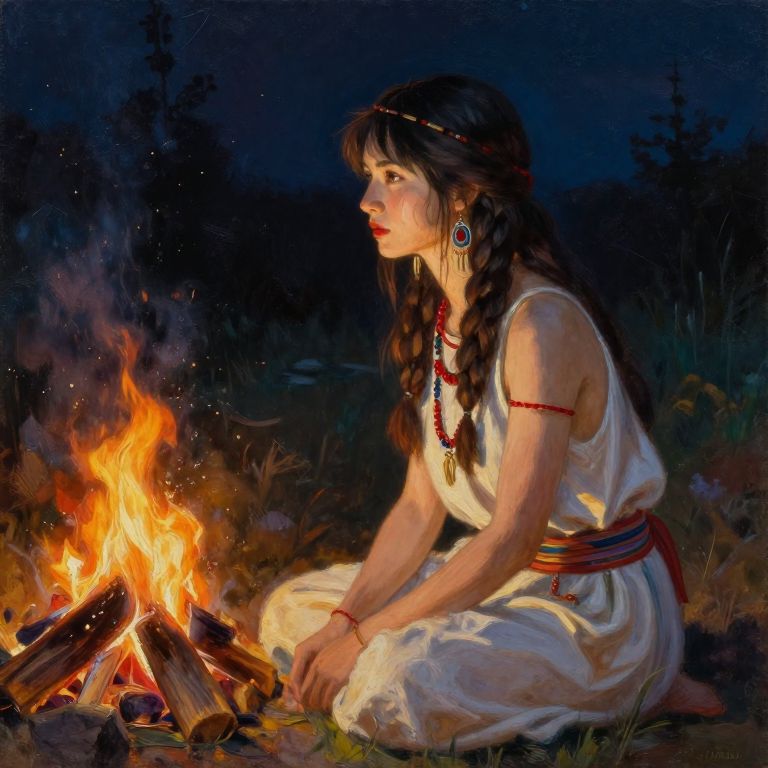 Digital painting of a young woman with long, dark braided hair, sitting by a campfire at night. She has fair skin and wears a white, sleeveless dress with red trim and a red belt, adorned with a beaded necklace and turquoise earrings. Her profile is illuminated by the fire's warm light, contrasting with the dark blue night sky and forest background. She sits cross-legged on grass, gazing thoughtfully at the flames. The firewood is visible, with bright orange and yellow flames rising. The style is realistic with a slight impressionistic touch, emphasizing light and shadow.