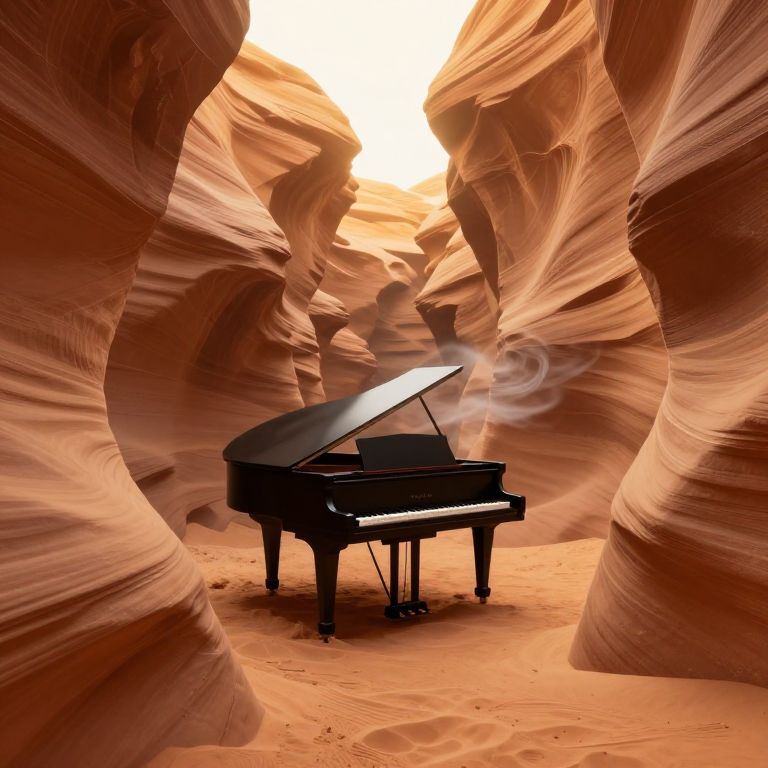 Photograph of a grand piano with its lid open, standing alone in a narrow, winding slot canyon. The canyon walls are smooth, curved, and illuminated by bright sunlight from above, casting warm, orange and red hues. Soft, wispy smoke trails rise from the piano keys, adding a mystical touch. The sandy, textured floor contrasts with the polished black piano, which is centrally positioned. The image combines natural beauty with an unexpected, surreal element, blending the grandeur of the canyon with the elegance of classical music.