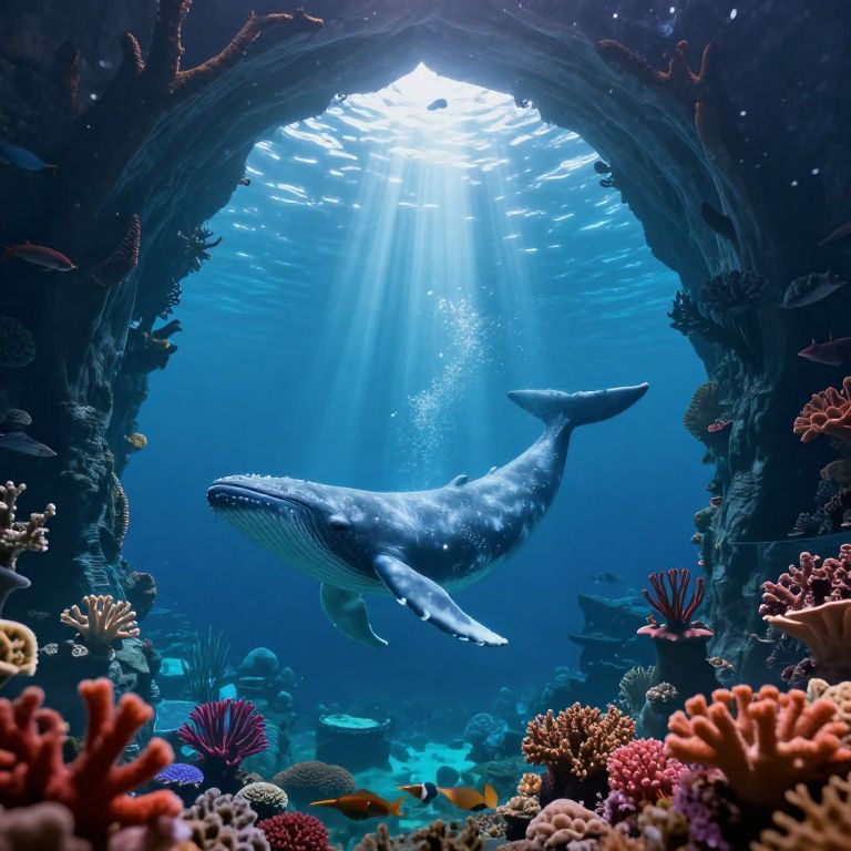 Photograph of a majestic blue whale swimming through a sunlit, underwater cave adorned with vibrant corals and marine life.