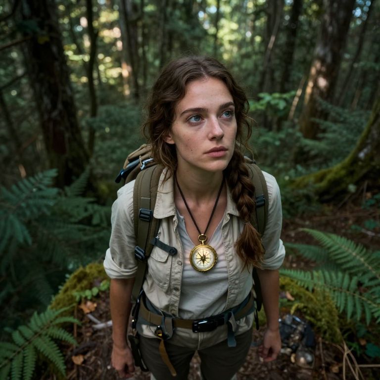 Craft a hyper-realistic portrait of an ethereal female explorer, adorned with a vintage compass pendant, her eyes lost in thought as she stands at the precipice of a dense forest. Capture this scene from an unconventional aerial viewpoint, showcasing intricate details of her attire and the mystical ambiance of her surroundings. Blend natural elements seamlessly with technological intricacies. Highlight the interplay between sunlight filtering through lush foliage and the soft luminescence emanating from her compass pendant, creating an emotional spectrum that draws viewers into a realm where adventure intertwines with nature's enchantment.