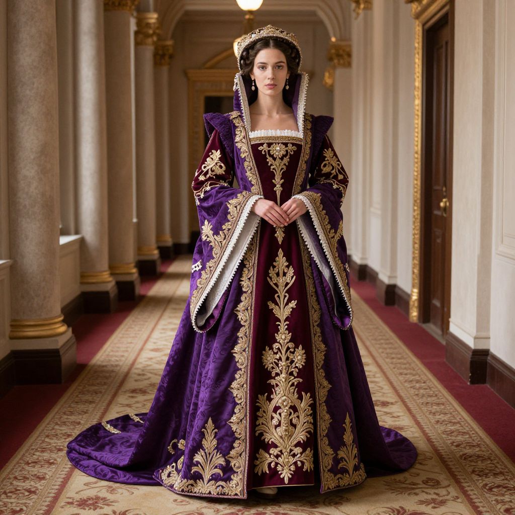 Woman wearing a regal purple and burgundy Tudor gown with intricate gold embroidery, featuring a French hood and flowing train, stands gracefully in an ornate hallway lined with columns and patterned carpeting.