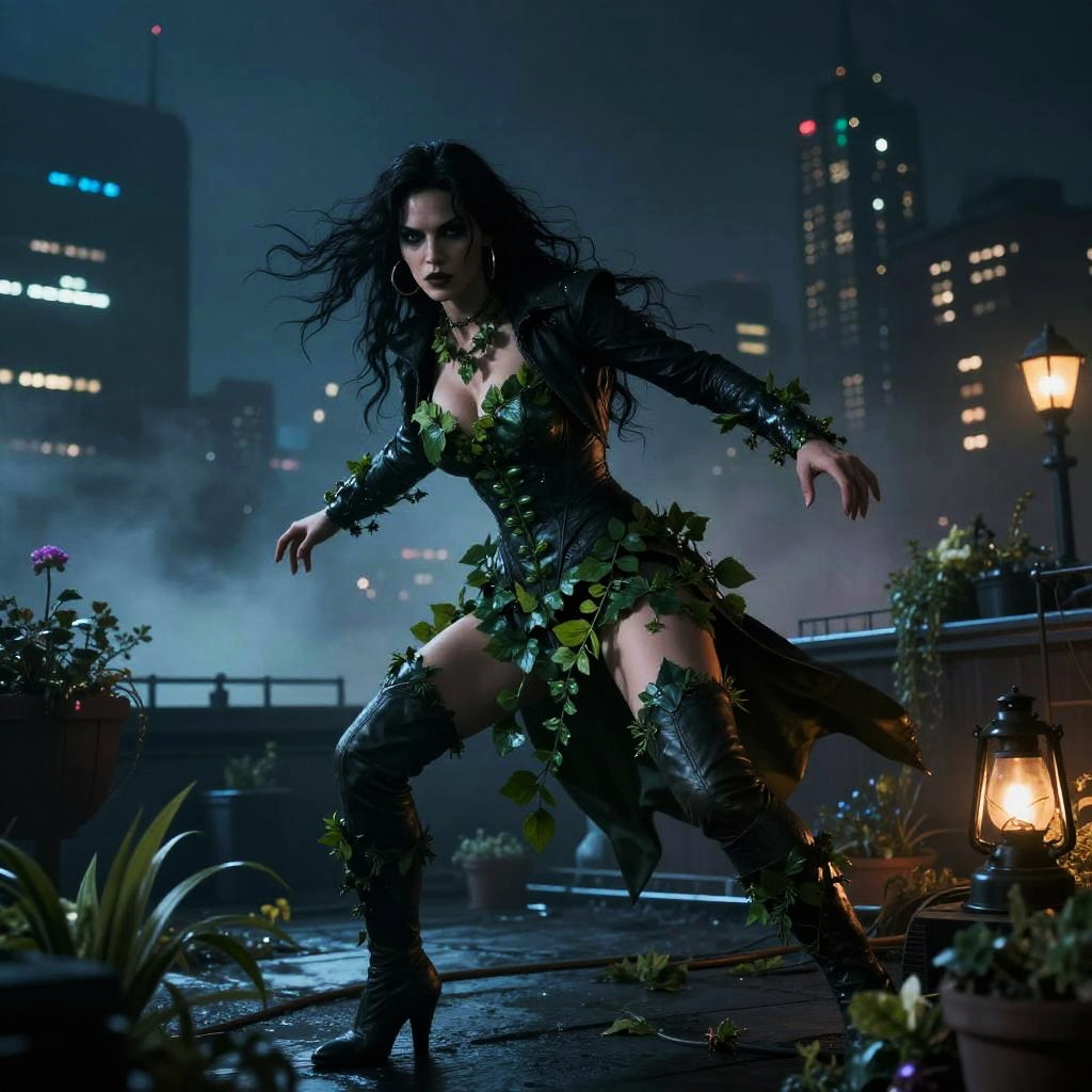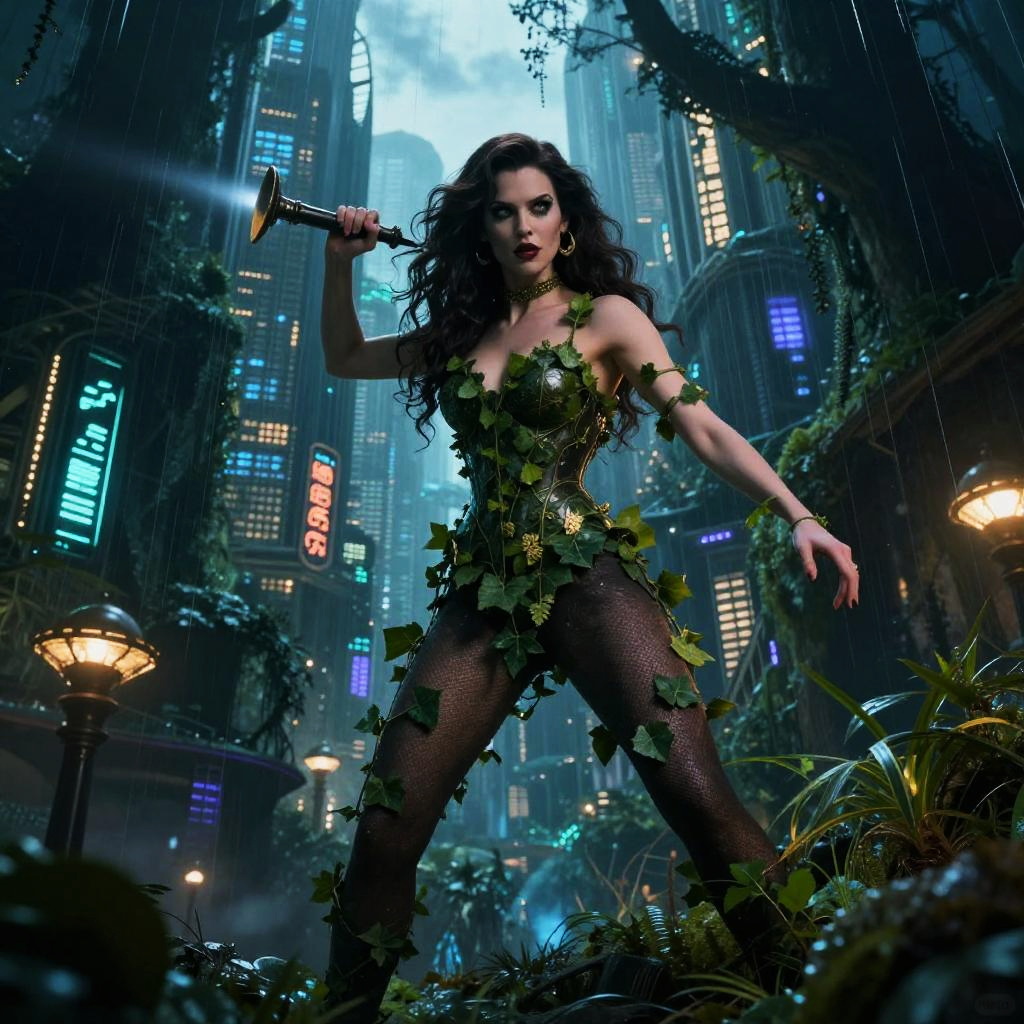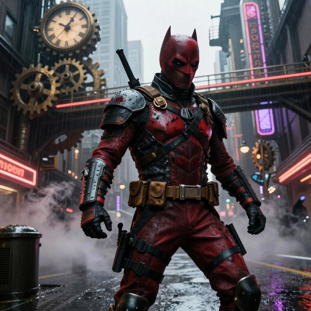 A reimagined Harley Quinn from the Batman universe, set in a vibrant street art canvas downtown. Directed by an experimental storyteller, the scene captures intense action with dramatic lighting, creating a cinematic atmosphere filled with deep shadows.